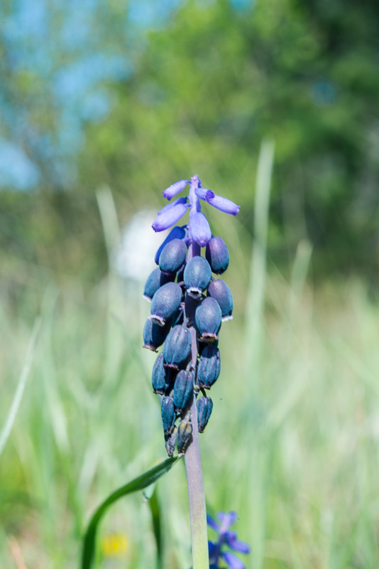 Geht man über die Straße, dann wachsen am steilen Hang im Trockenrasen wilde Weinbergs- Traubenhyazinthen (Muscari neglectum).