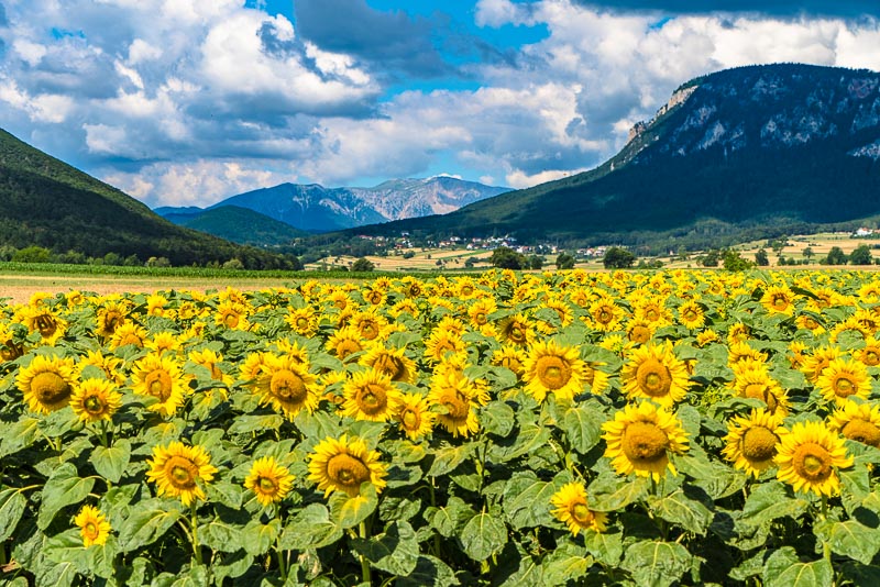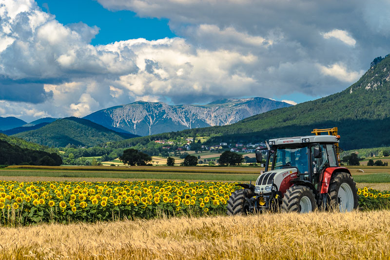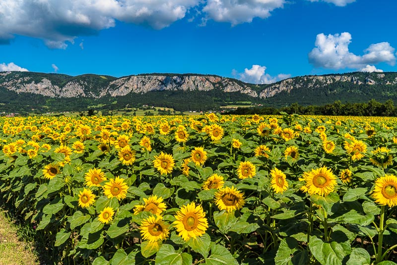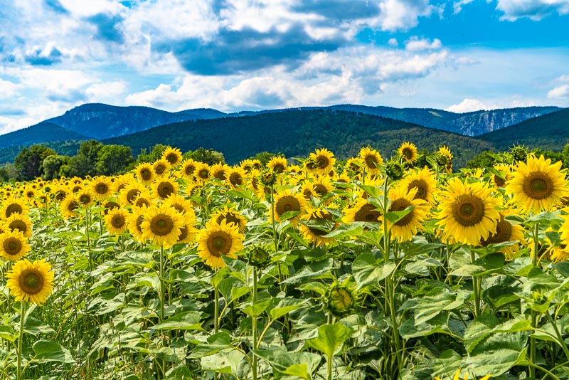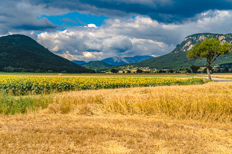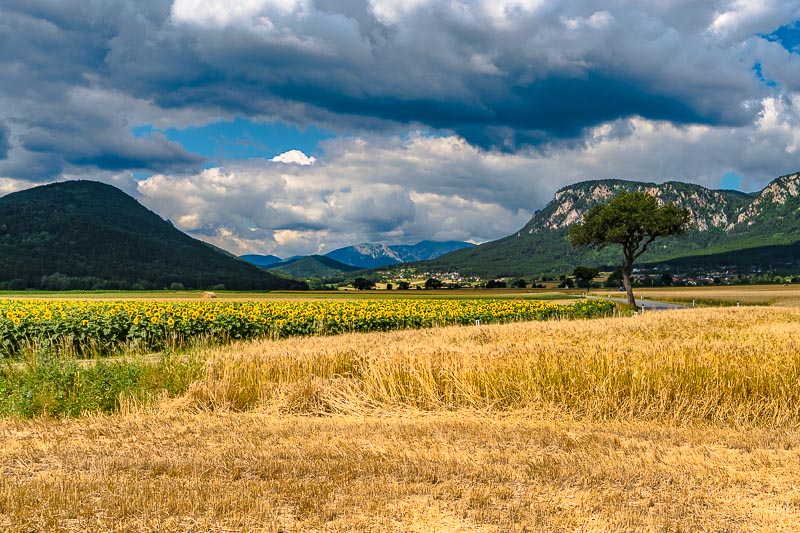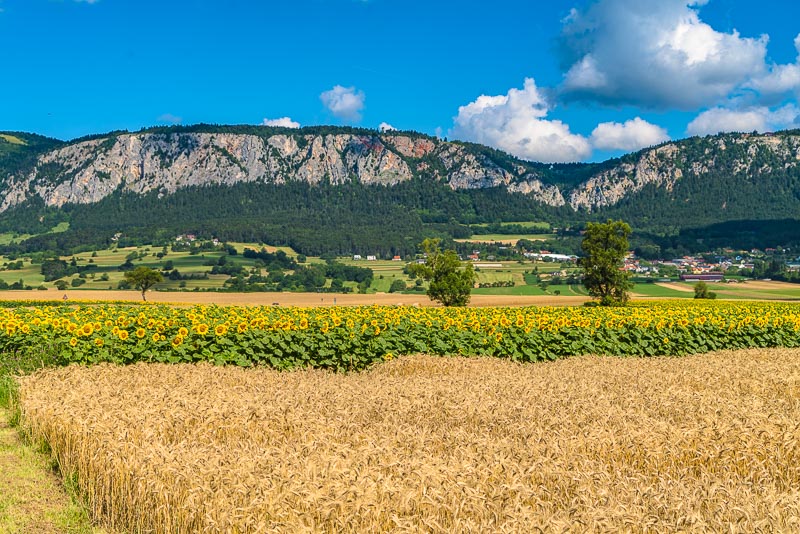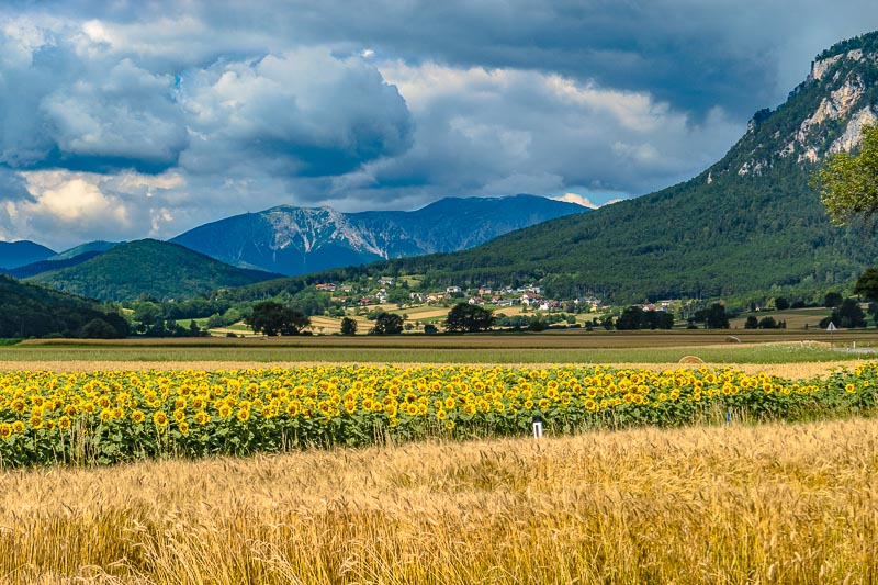 Ich fahre durch die Prosset Schlucht, biege bei der Teichmühle nach links ab und danach rechts Richtung Maiersdorf. Gleich nach der Brücke über den Bach die ersten Sonnenblumenfelder.