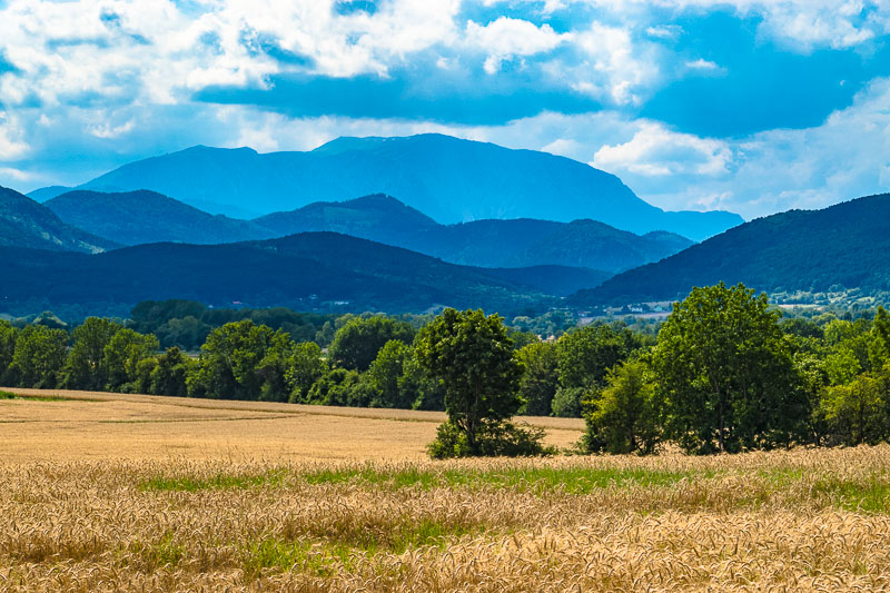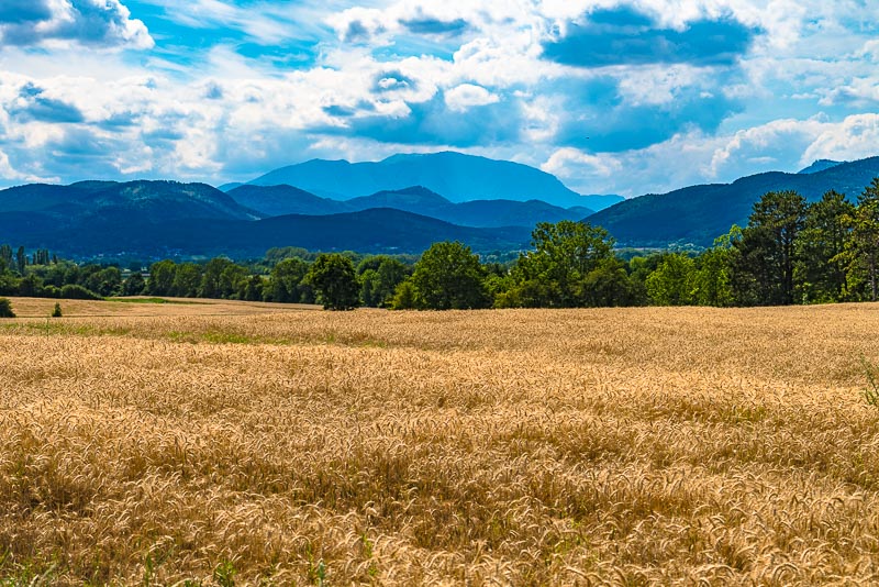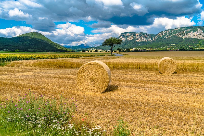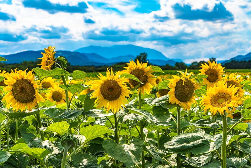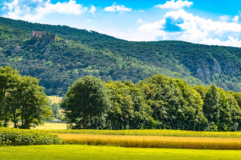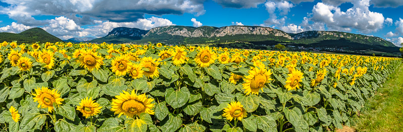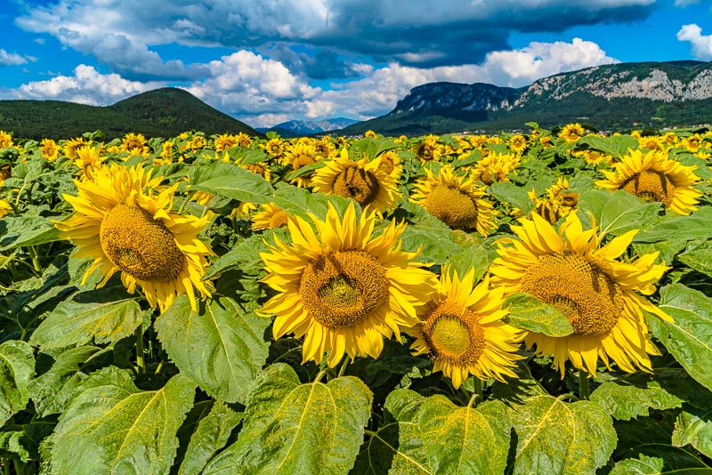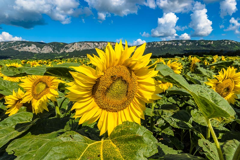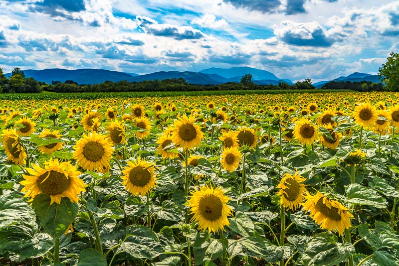 Ich fahre durch die Prosset Schlucht, biege bei der Teichmühle nach links ab und danach rechts Richtung Maiersdorf. Gleich nach der Brücke über den Bach die ersten Sonnenblumenfelder.