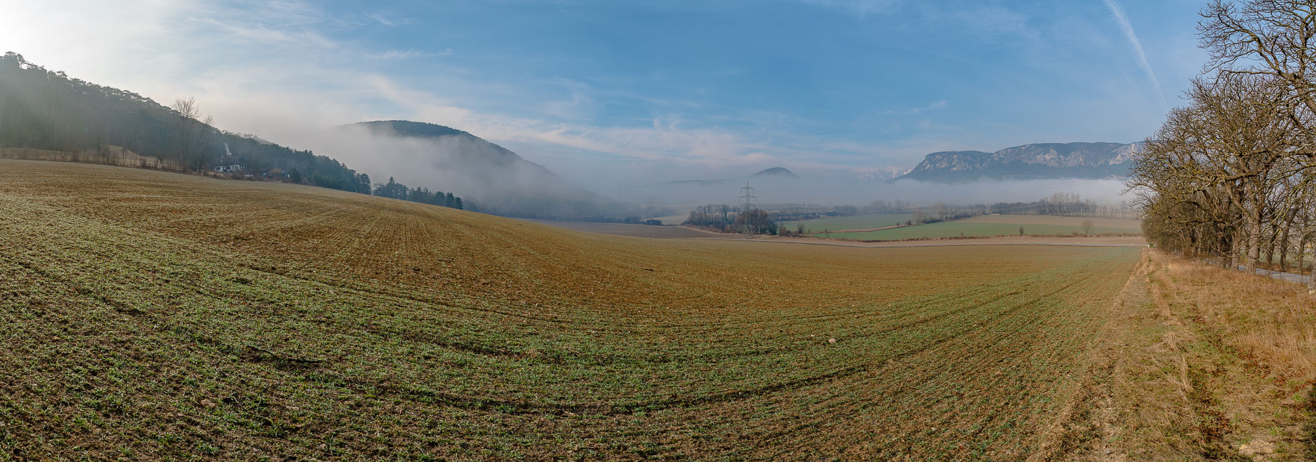 Panorama von der Kastanienallee zu Ruine Emmerberg, Kienberg, Schneeberg und Hohe Wand.
