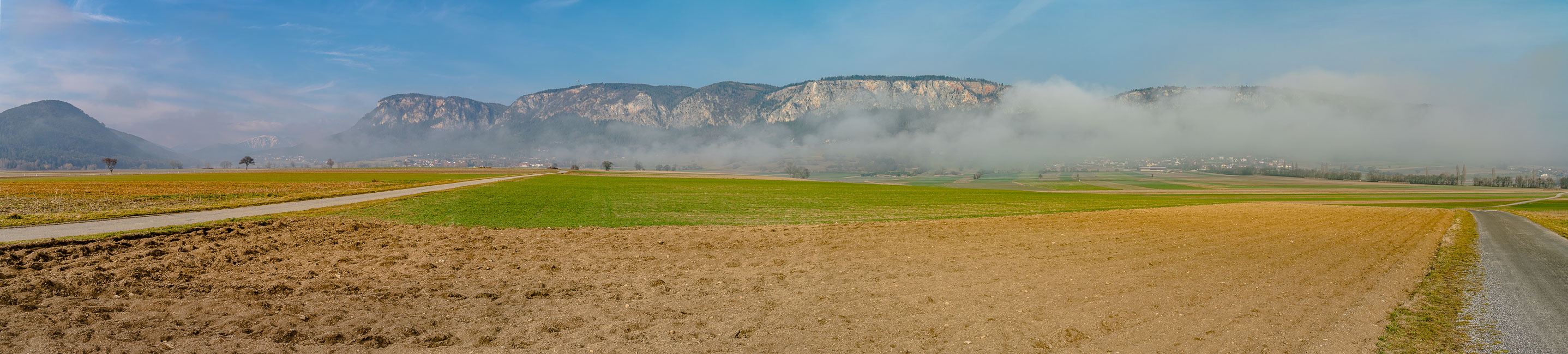 Panorama der Hohen Wand, links Kienberg, der Schneeberg hinter dem Nebel.