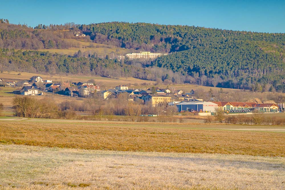 Blick über die Wiesen nach Stollhof und, dahinter am Hang, zum Rehabilitationzentrum Felbring.
