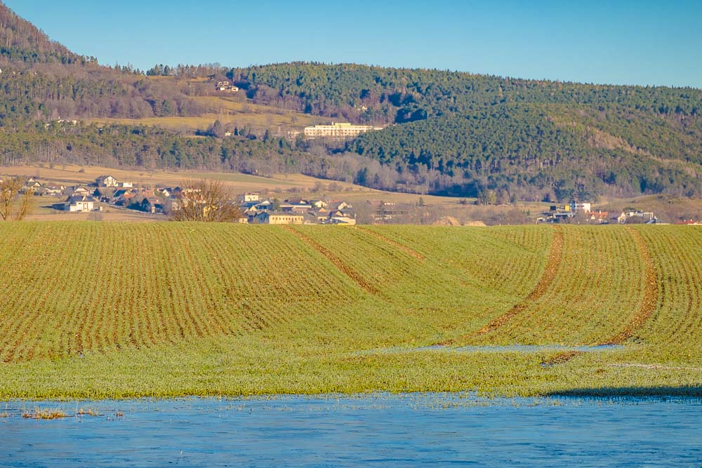 Nach dem vielen Regen sind manche Wiesen und Felder überflutet.