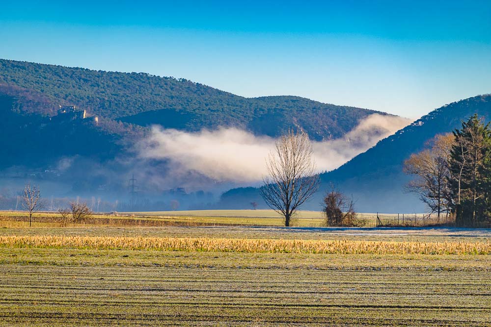 Blick zur Ruine Emmerberg, letzte Nebelreste in der Prosset Schlucht.