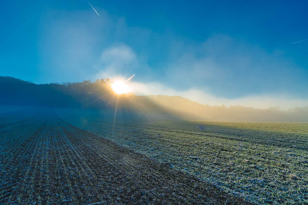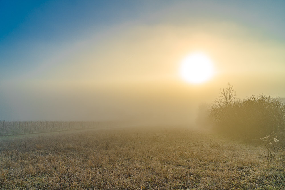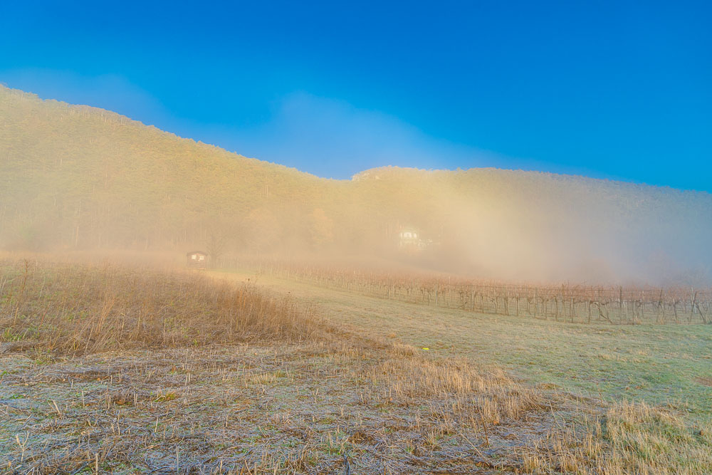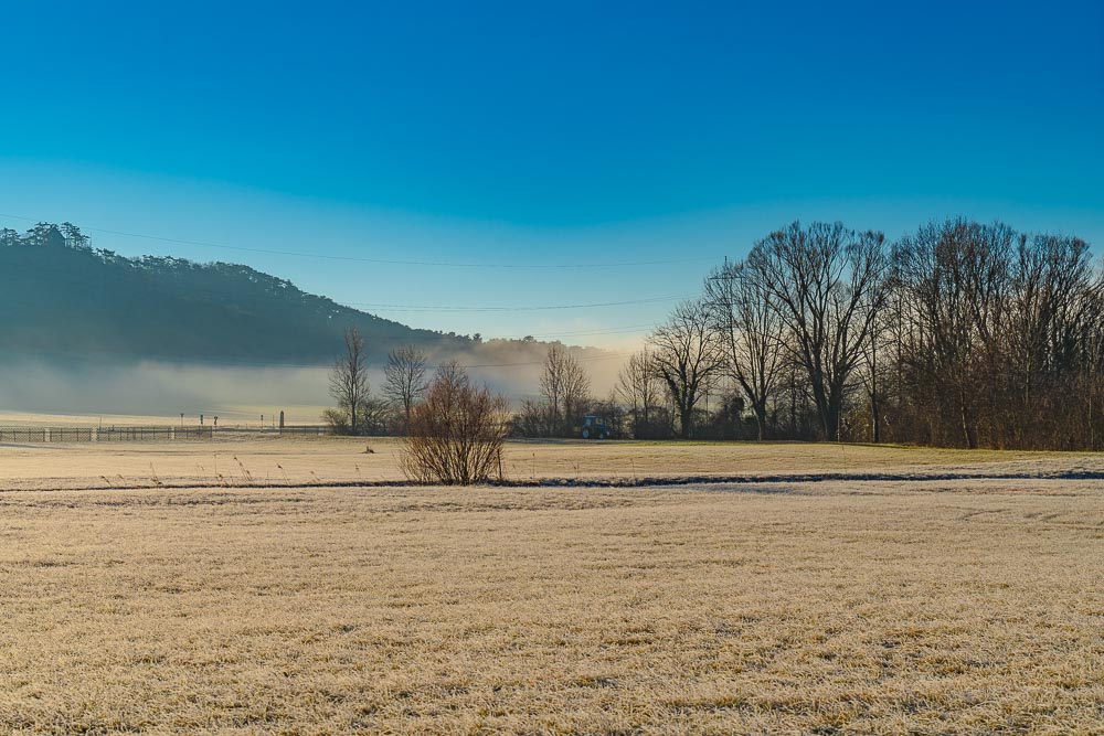 Nebel im Tal, Sonne in der Höhe. Ich fahre zunächst zu den Weingärten am Ortsrand von Winzendorf, dann aber aus dem nebligen Winzendorf durch die Prosset Schlucht in die Neue Welt und über Höflein und Willendorf zurück.