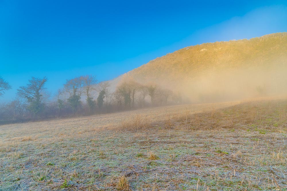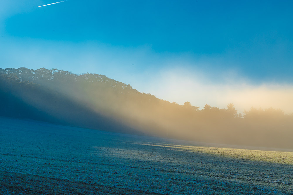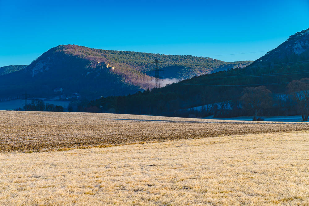 Nebel und Sonne hinter der Ruine Dachenstein.