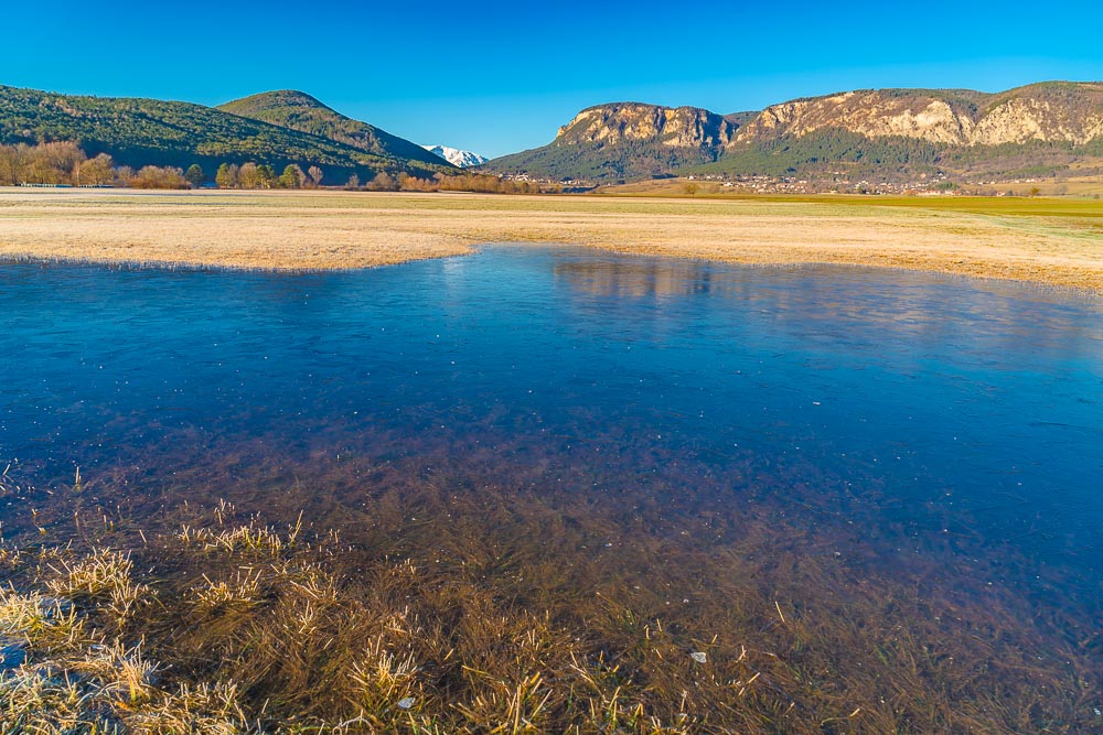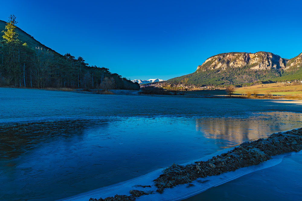 Beim Biotop Zweiwiese hat sich daneben eine große Lacke gebildet. Im Frost der schattigen Lage ist hier alles gefroren.