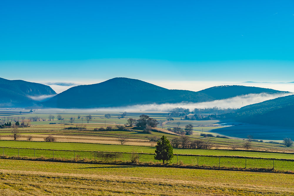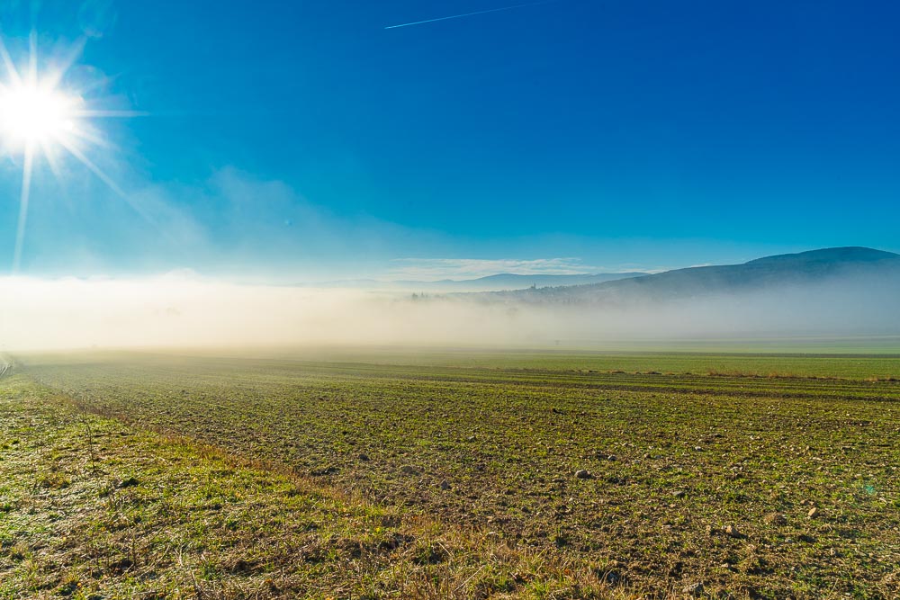 Stellenweise wallt der Nebel weiter herauf, wie hier knapp vor Willendorf. Hierher oder ins Bild klicken für eine größere Darstellung