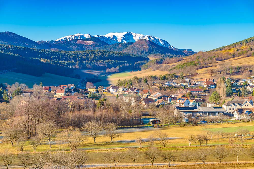 Nächste Etappe: bei der Wallfahrtskirche Höflein, Blick über Höflein zum Schneeberg ...