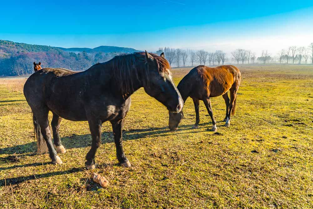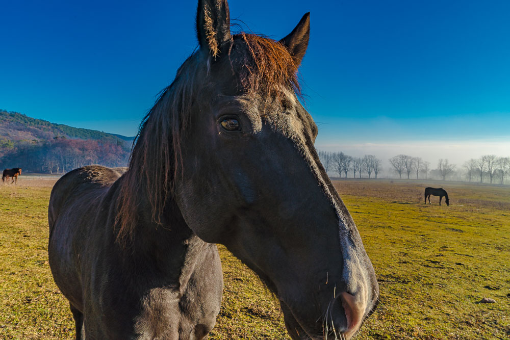 Da kommt ein neugieriges Pferd und nimmt Kontakt auf.