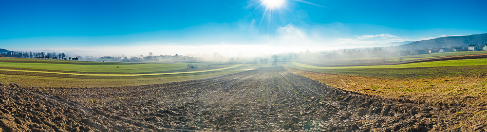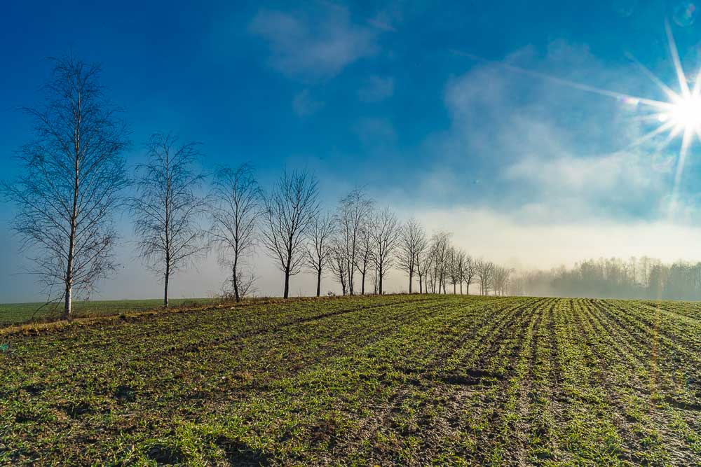 Birkenallee zwischen den Feldern, Blickrichtung St. Egyden, das ganz vom Nebel bedeckt ist.