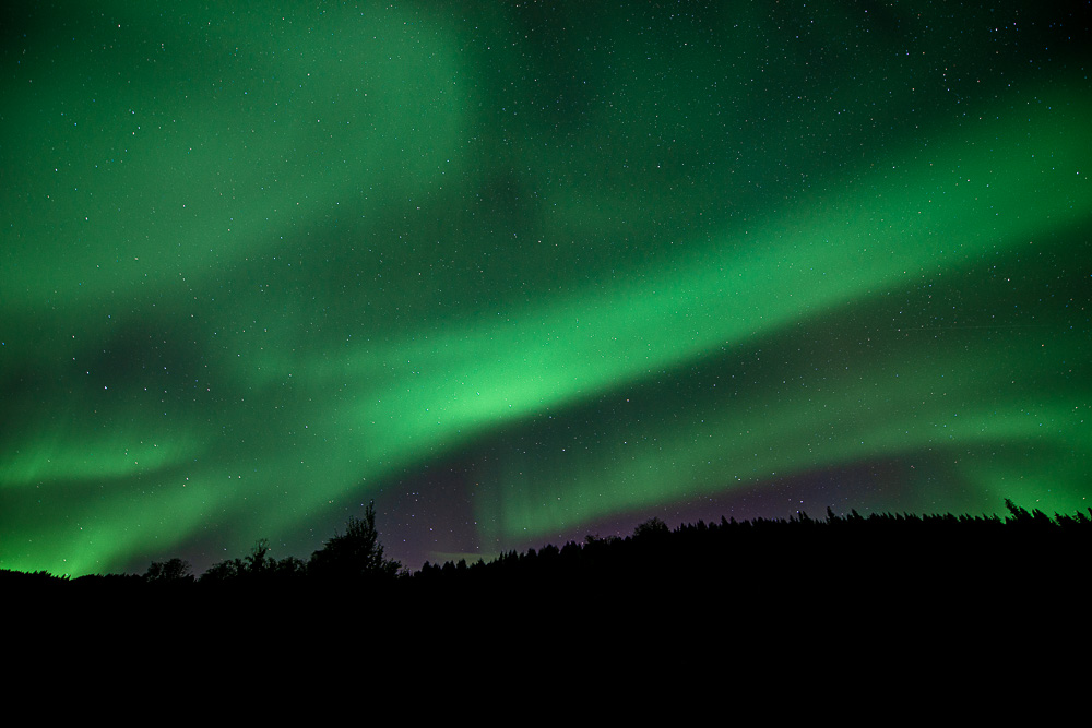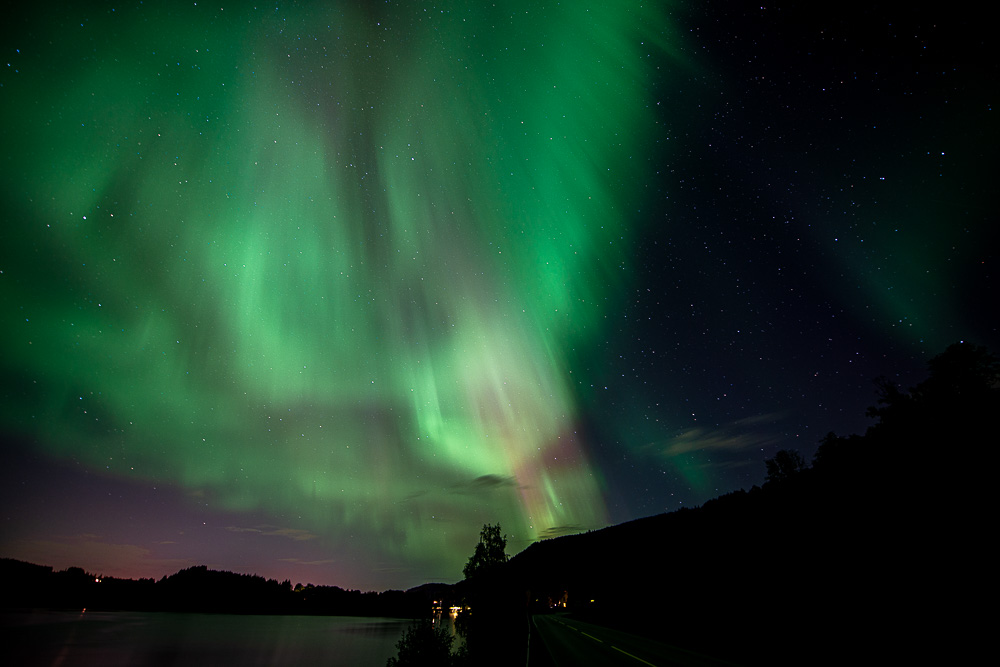 Wir fahren abends ein Stück die Autobahn zurück auf eine Anhöhe. Hier sieht man zwar sehr gut nach Norden und Westen aus, aber die Autobahn ist beleuchtet - das macht die ersten schwachen Nordlichter mit dem freien Auge nicht sichtbar - am Bild der Kamera sind sie allerdings zu erkennen.