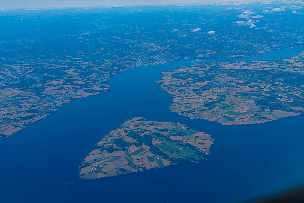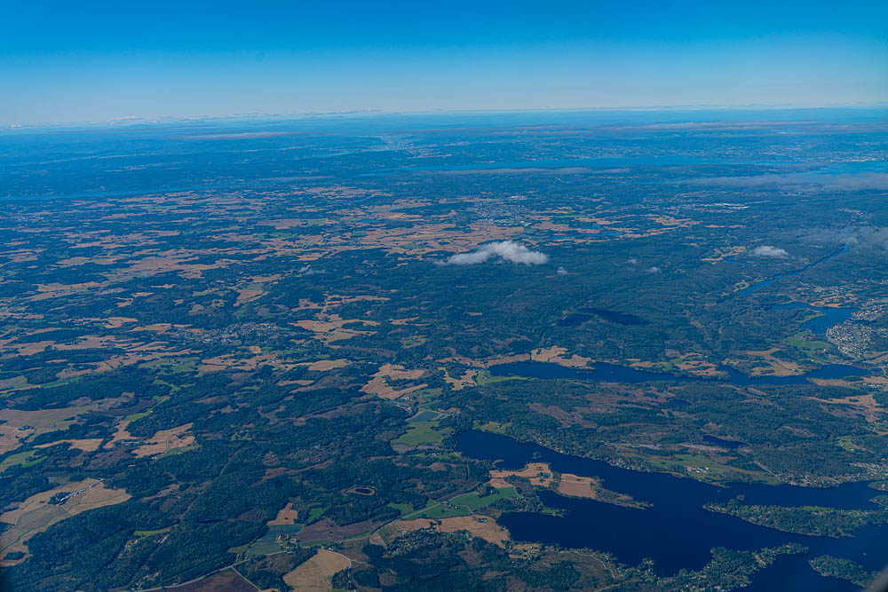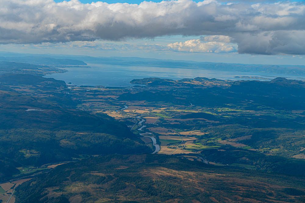 Von Osten fliegen wir auf den Trondheimer Flughafen Værnes zu - in der Mitte des Tals nahe am Meer kann man schon die Landebahn erkennen.