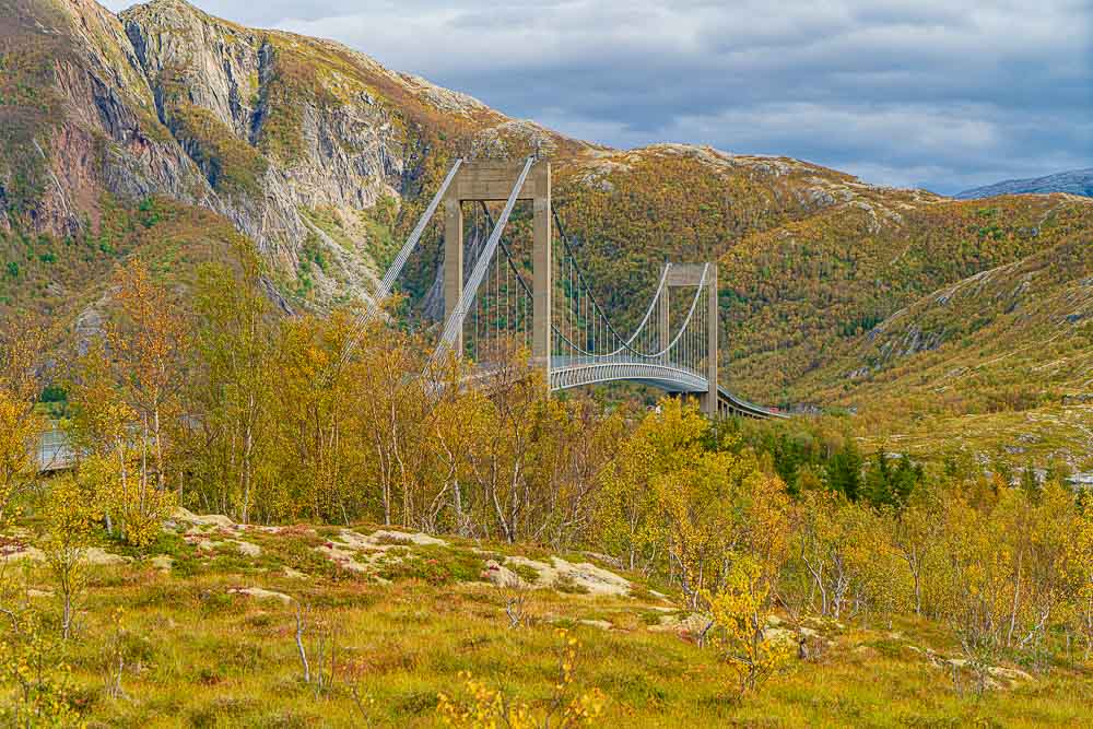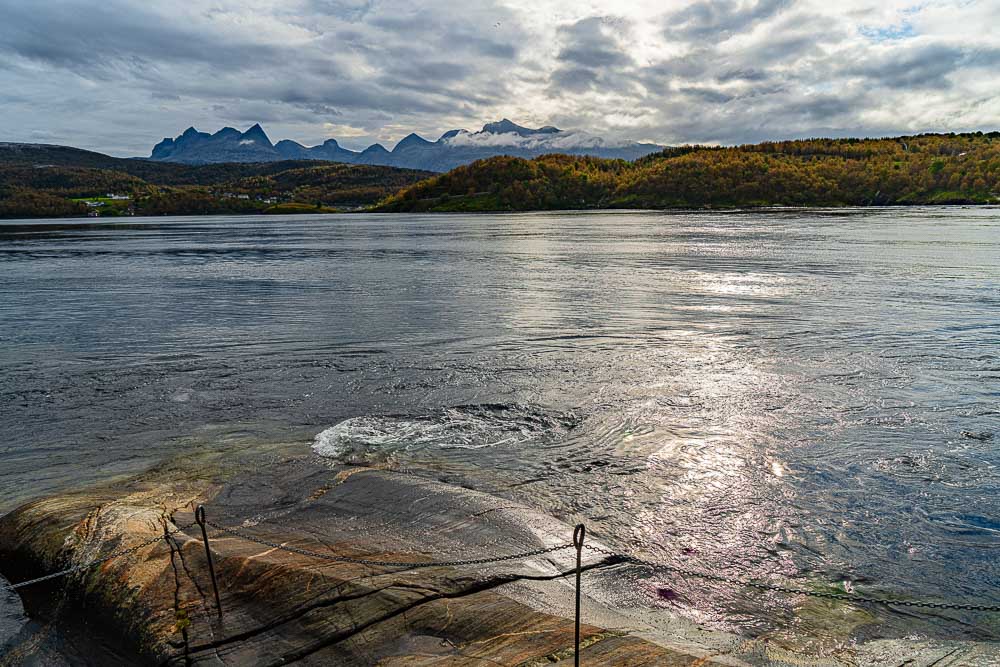 Auf einer gewaltigen Brücke überqueren wir schließllich auch den Saltstraumen, eine Engstelle im Fjordsystem, zwischen Saltfjord (bei Bodø) und Skjerstadfjorden, der dutzende km weit ins Land bis nach Rognan reicht. Durch die starken Zuflüsse in den oberhalb gelegenen Skjerstadfjord und den starken Tidenhub entsteht an der Engstelle eine starke, bis zu 40 km/h schnelle Strömung und es können sich bis zu 4 m tiefe Strudel bilden (siehe auch Wikipedia).