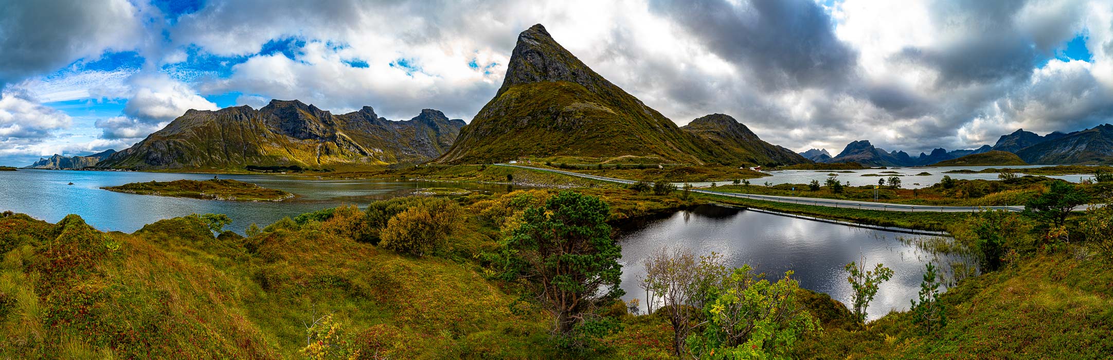 Zwei große Brücken führen hinüber nach Fredvang. Auf der kleinen Schäreninsel Storbuøya vor der ersten Brücke hat man einen schönen Blick zur Straße, dahinter der markante Volandstinden (457 m), links hinten der Stortinden (866 m). Ganz links die Ortschaft Ramberg.