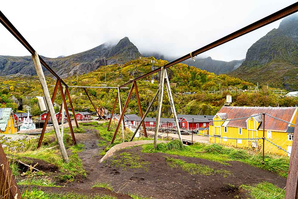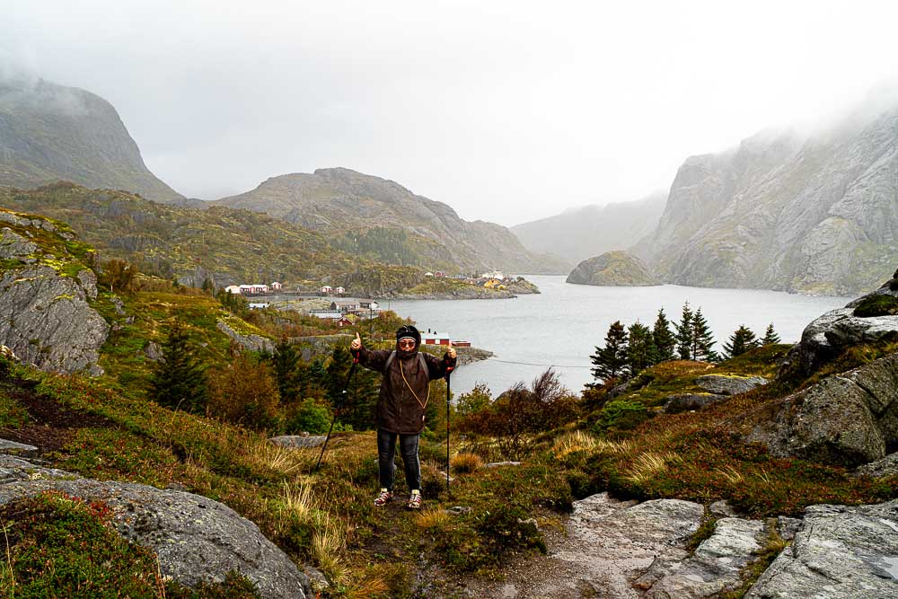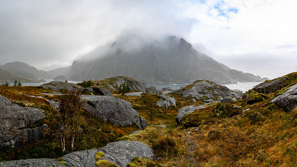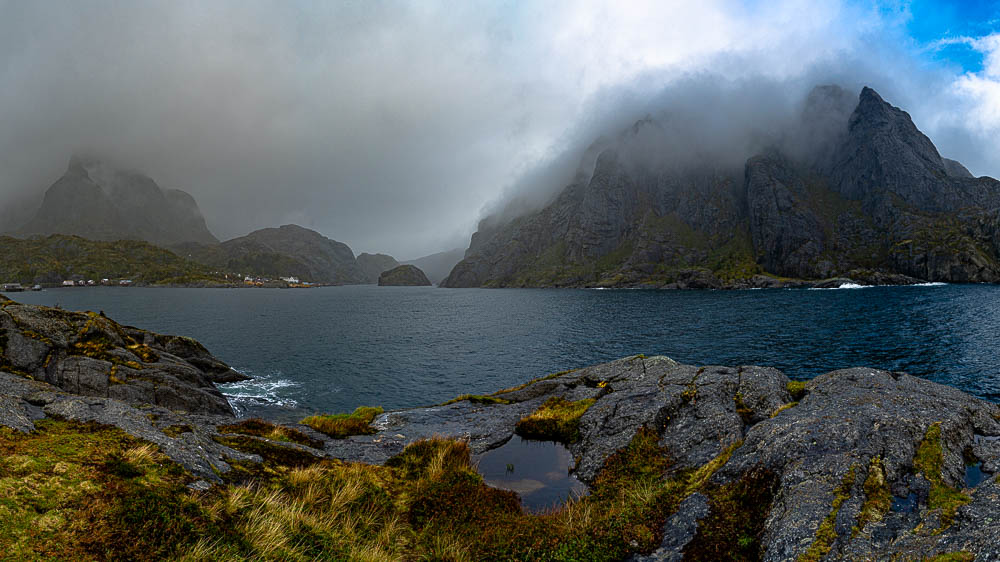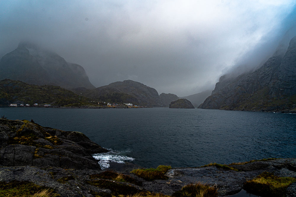 Gleich bei den Hütten des Hotels ein Felsklotz, von dem man eine gute Aussicht hat auf den Fjord und das Dorf.