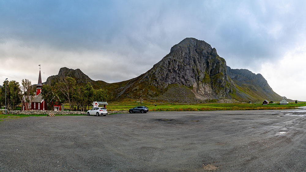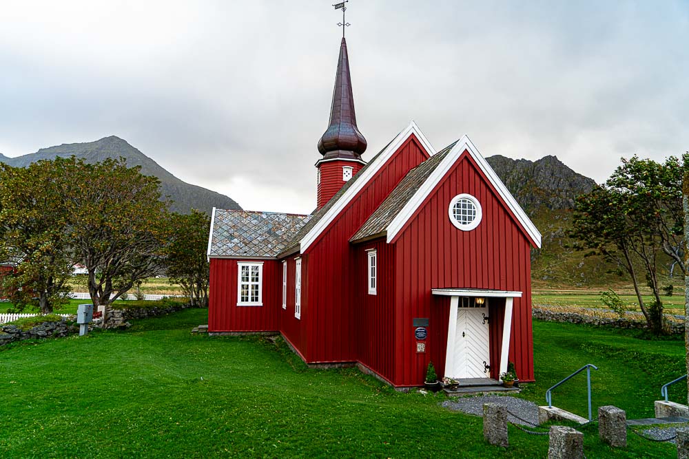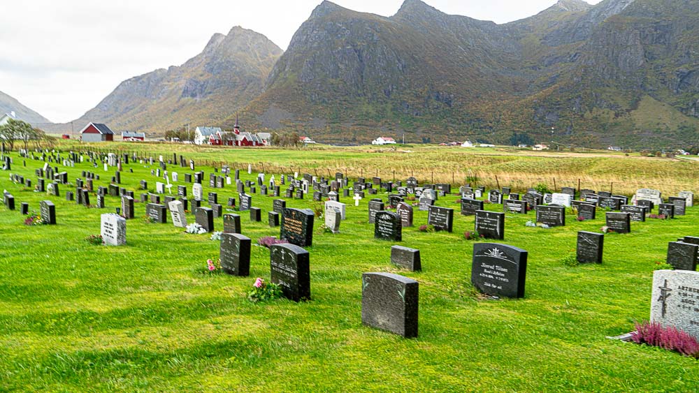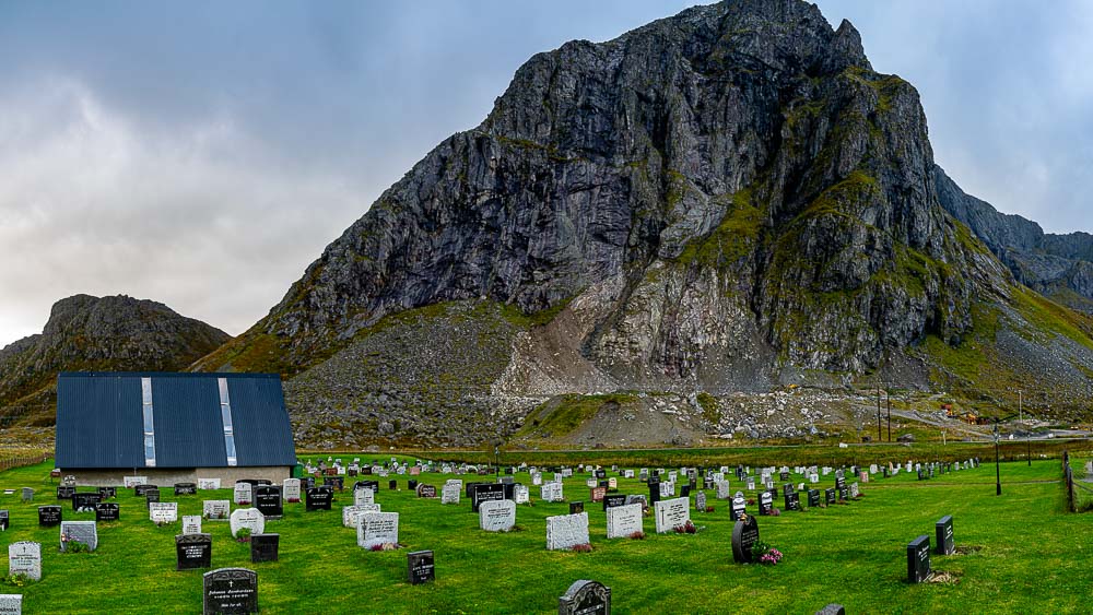 Der Friedhof von Flakstad, dahinter der Flakstadtinden (484 m).