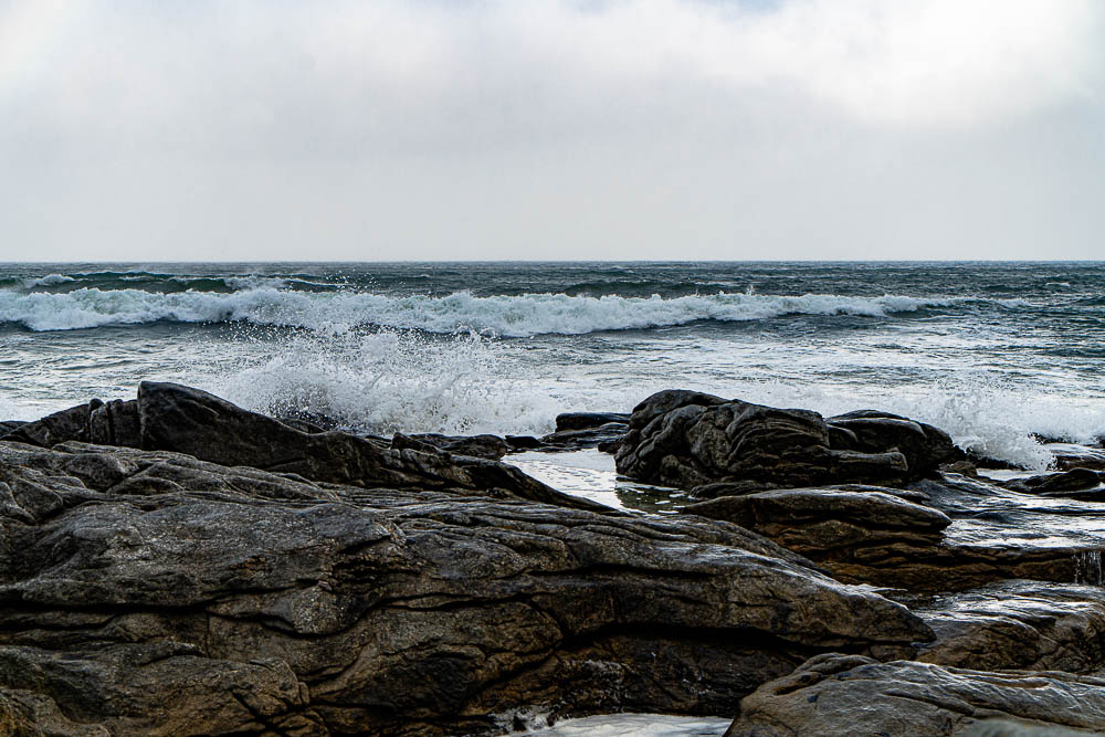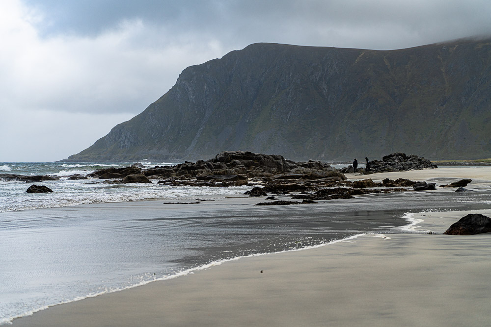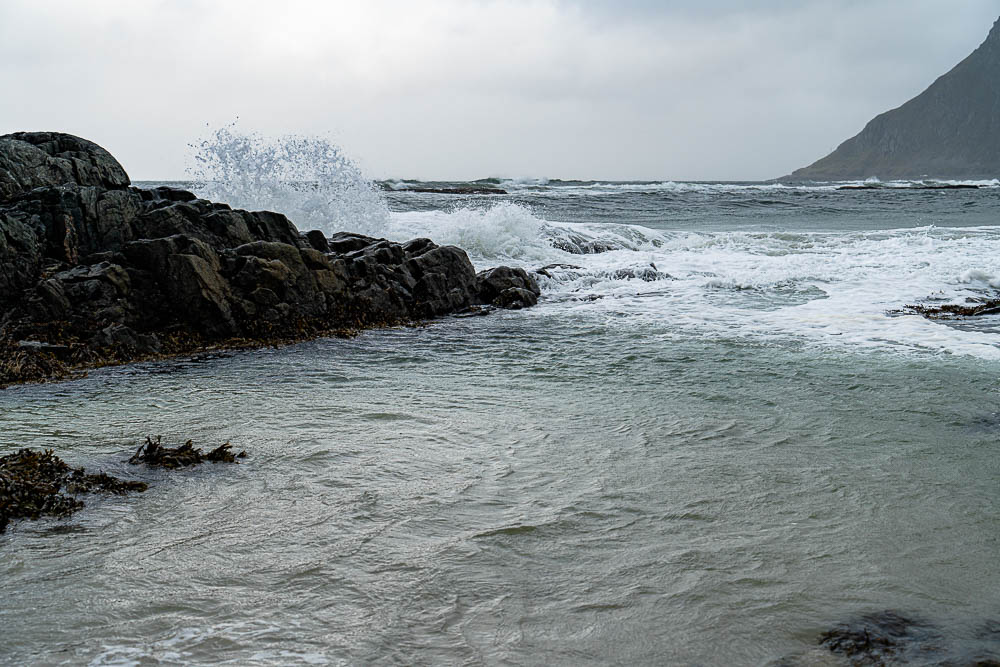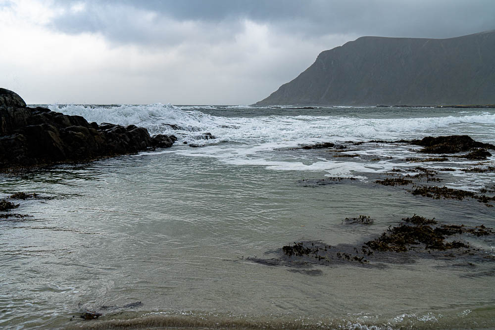 Heute ist es wieder regnerisch, dazu aber auch noch stürmisch - zumindest dort, wo der Wind ungestört wehen kann, das ist in dem Fall auf der anderen Seite der Insel. Wir wollen´s wissen und fahren zur Nordwestküste, sprich nach Flakstad.