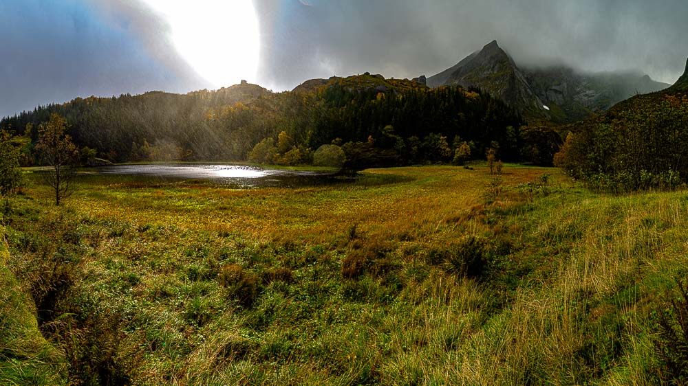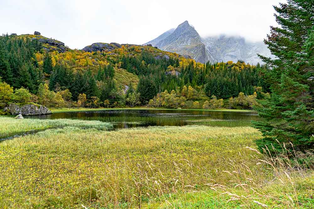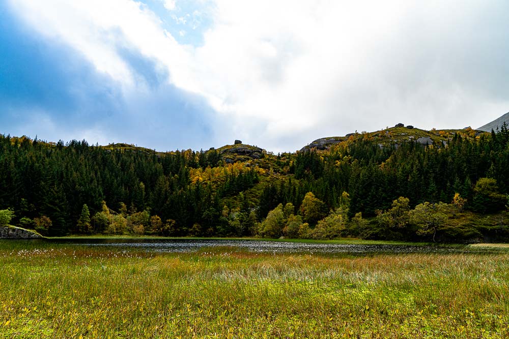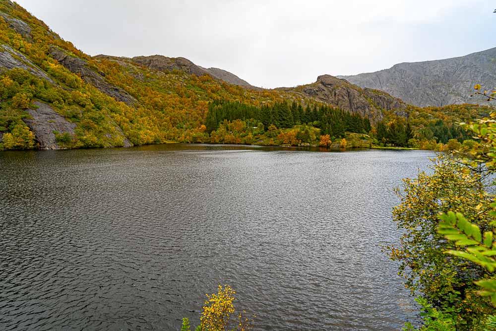Da das Wetter jetzt besser wird und im engen Tal hinter Nusfjord kein Wind geht, wandern wir noch ein kleines Stück zu den beiden Seen oberhalb von Nusfjord. Hier das Nervatnet (auf 14 m SH), ...