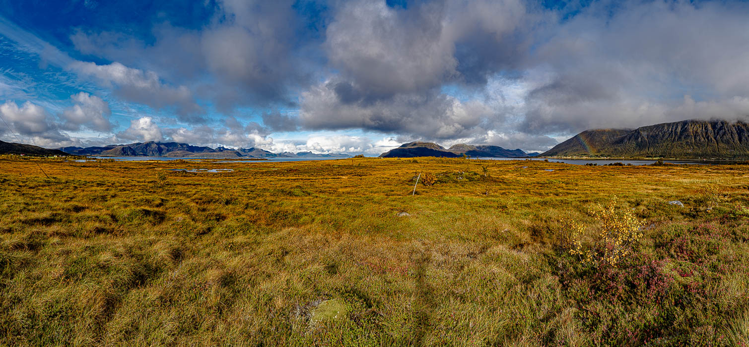 Panorama der Landschaft zwischen Reinsnes und Roksøy. Irgendwo in der Ferne ist Risøyhamn.