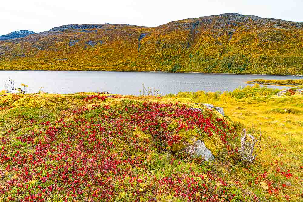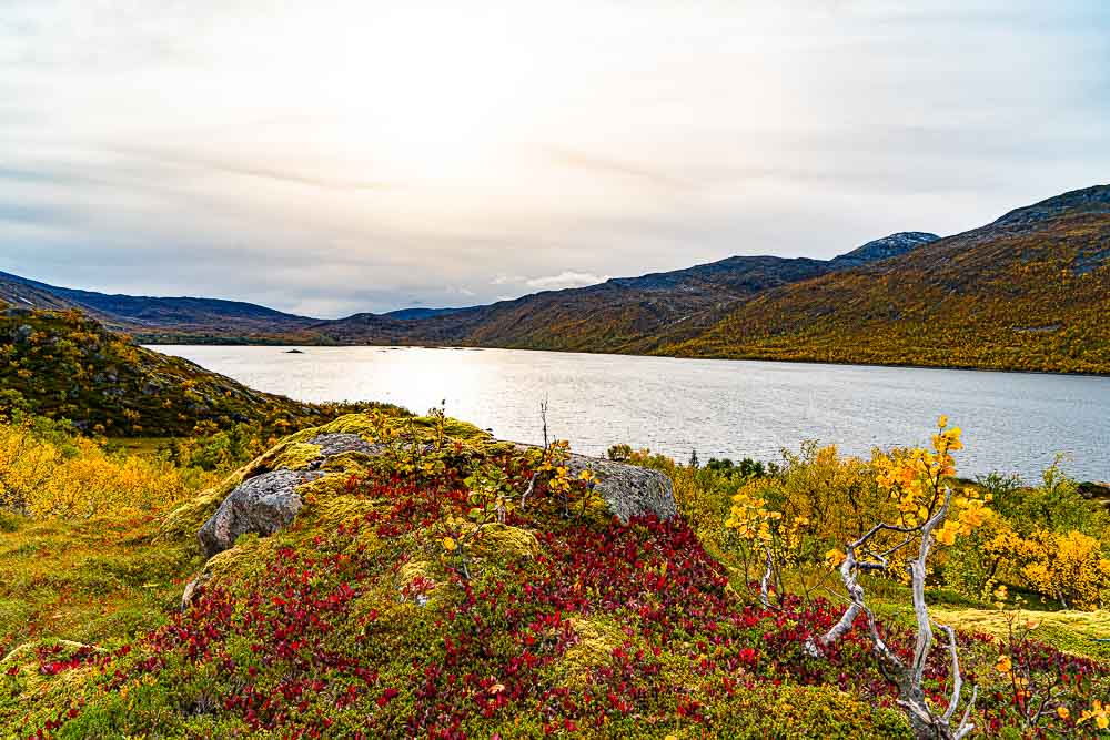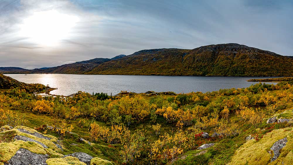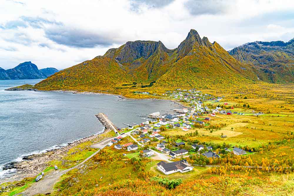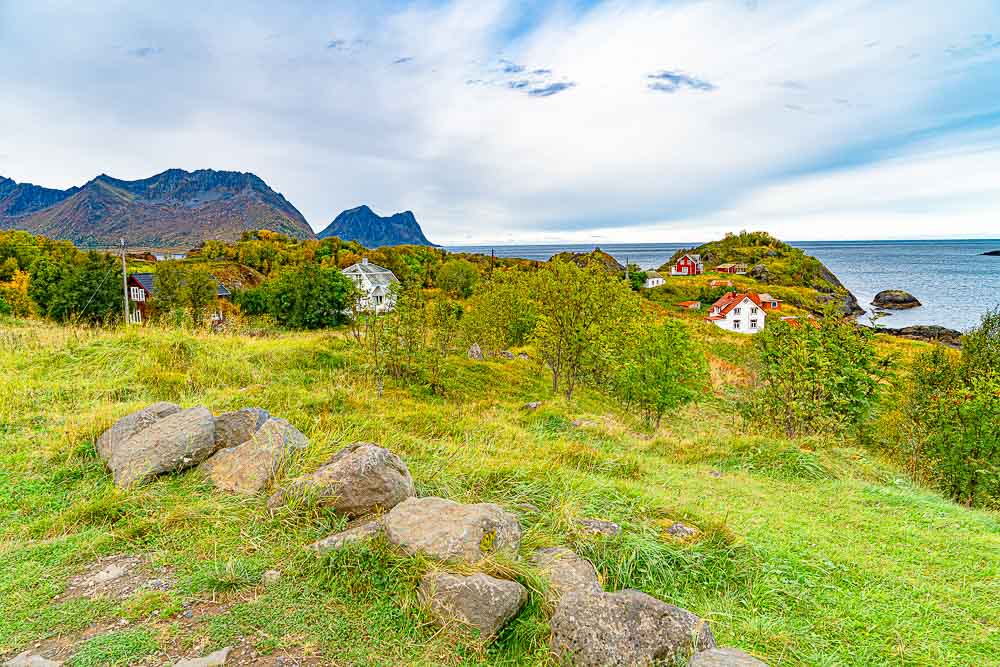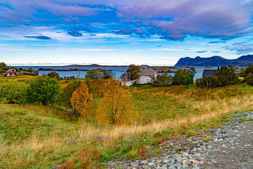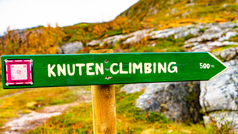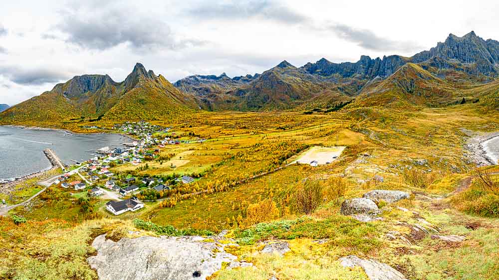 Wir sind, nach einem weiteren Tunnel, am heutigen Ziel angekommen, in Mefjordvær. Nachdem wir im Hotel eingecheckt sind, wandere ich auf den 110 m hohen Knuten, von wo man einen wunderbaren Ausblick auf den Ort hat.