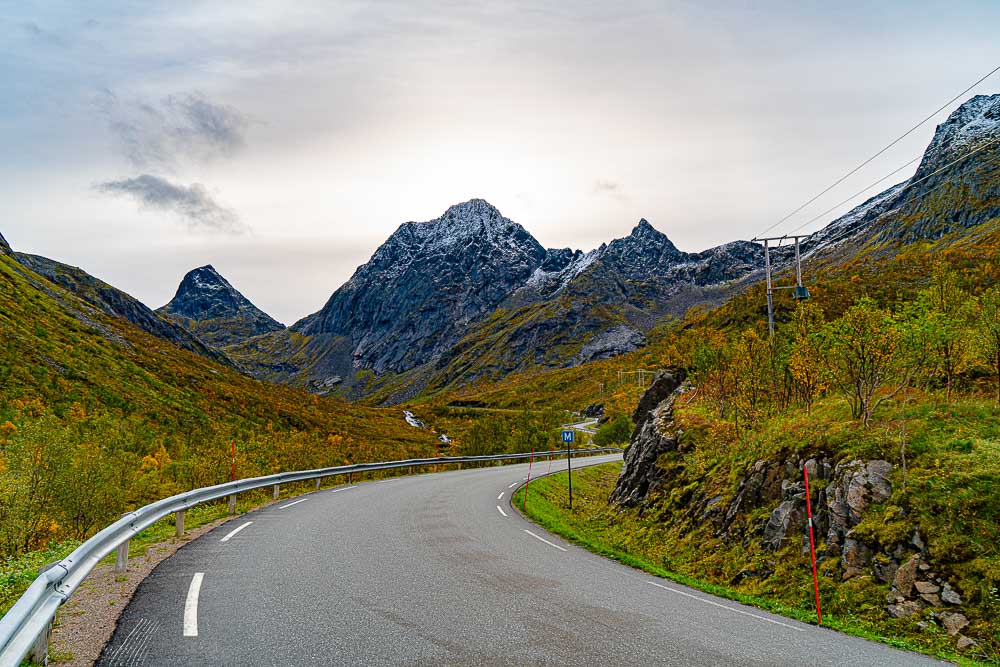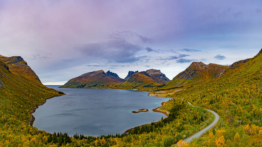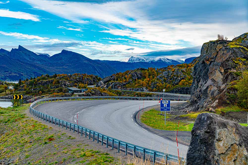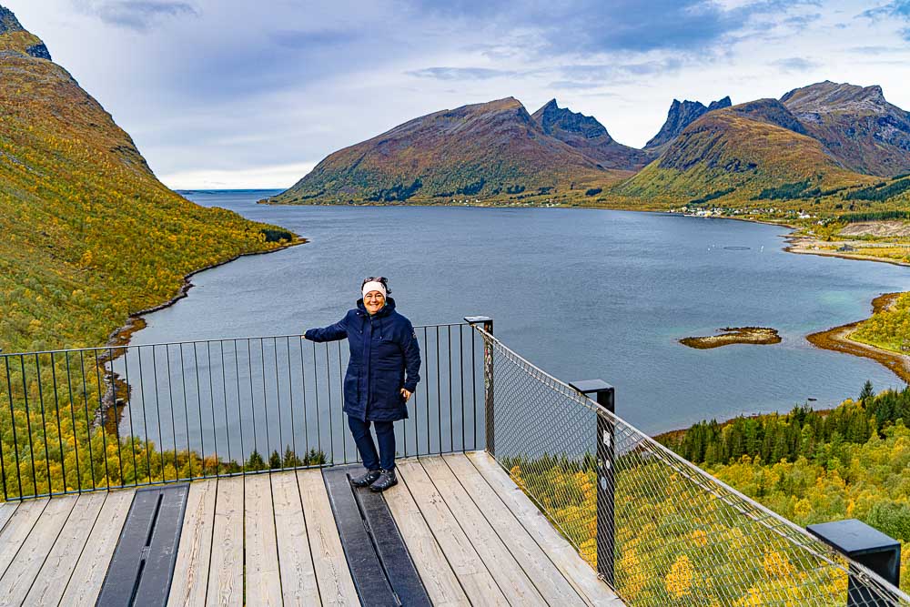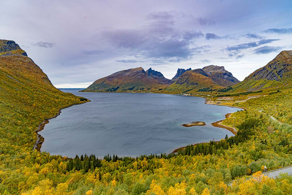 Nach einem weiteren Tunnel am Bergsfjordveien kommen wir zur Aussichtsplattform oberhalb von Bergsbotn, die bei einer Straßenkehre wunderschön in die Landschaft gebaut wurde. Vor uns der Bergsfjord mit seiner hintersten Bucht, dem Bergsbotn.