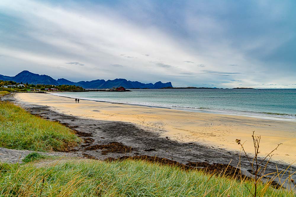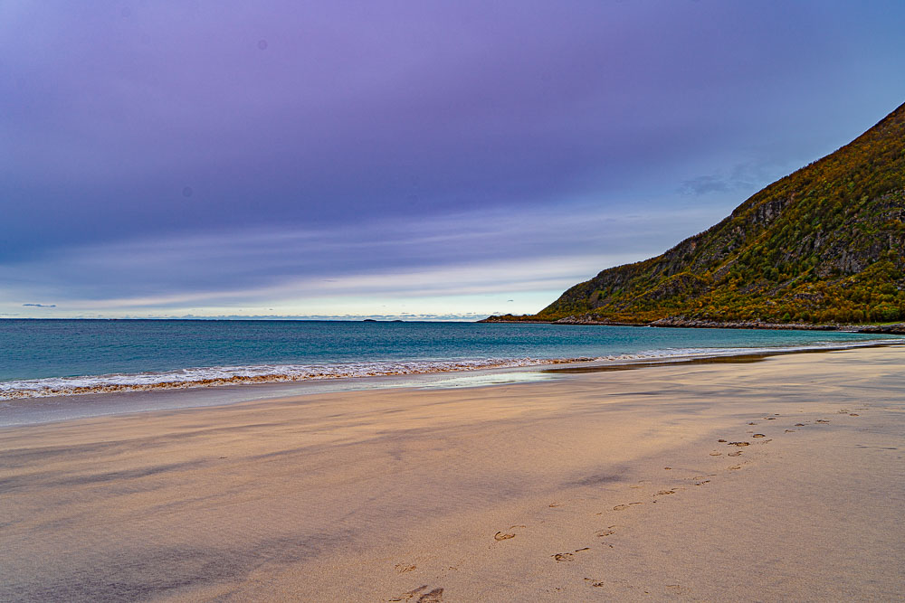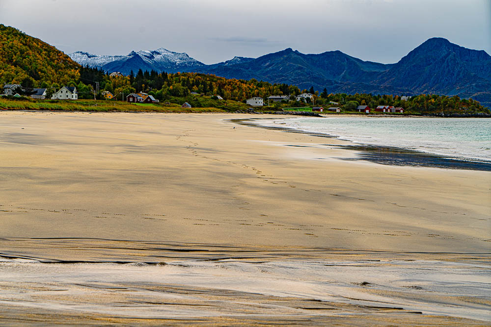 Wir sind jetzt nicht wieder zum nächsten Tunnel abgezweigt, sonder nach Skaland und in einer Sackgasse bis nach Bøvær gefahren. Am Ende der Straße dieser wunderbare Sandstrand.