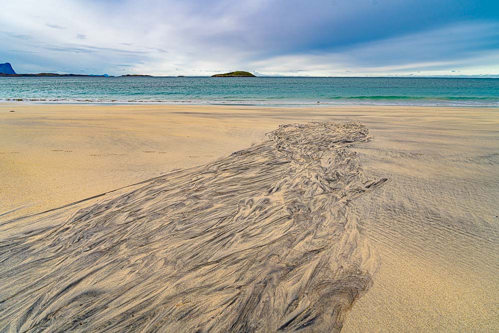 Sandstrand bei Bøvær. Wasser eines kleinen Baches rinnt über den Sand und bringt schwarze Erde mit, die ein wunderbares Muster in den Sand zeichnet.