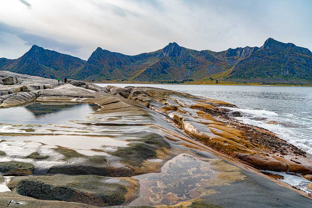 Wir sind zurück und weiter gefahren, nun doch durch den Tunnel ins Tal des Steinfjorden. Die Landzunge, die den Steinfjord vom Ersfjord trennt, wird Tungeneset genannt; hier gibt es wieder eine schöne Aussichtsplattform, die auf die abgeschliffenen Felsen am Strand leitet, auf denen man weiter spazieren kann, ...