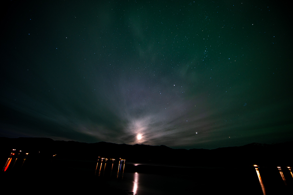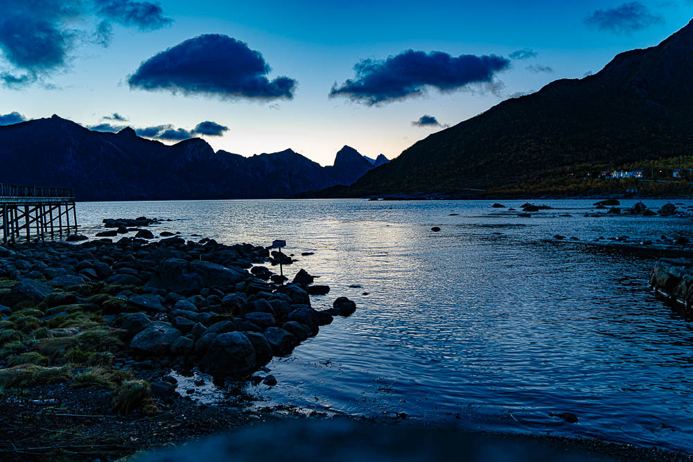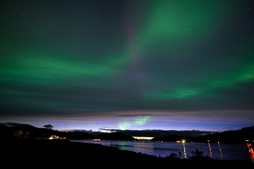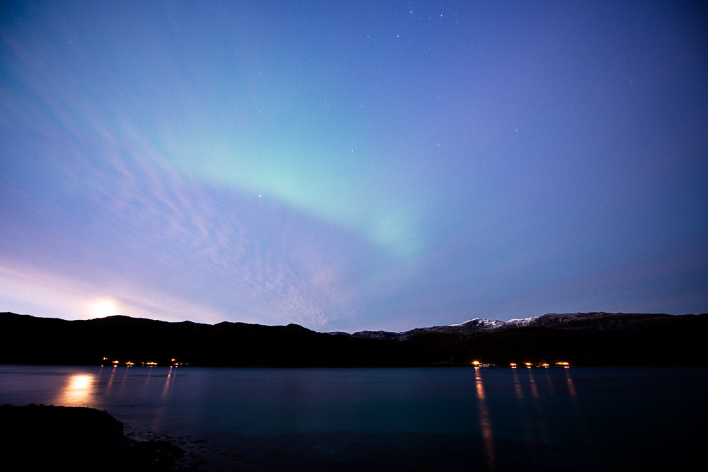 Da der Himmel weitgehend klar ist und Nordlichter vorausgesagt sind, fahren wir in der Abenddämmerung wieder los, über die Brücke zur Insel Kvaløya und diesmal die Ostküste entlang bis nach der Tunnelabzweigung zur Insel Ringvassøya, zu einer Stelle an der Küste des Kvalsundet, der auf der Norgeskart als "Rakknesklubben" bezeichnet wird. Hier ist es perfekt dunkel, bis auf wenige Lichter auf Ringvassøya auf der anderen Seite des Sunds.