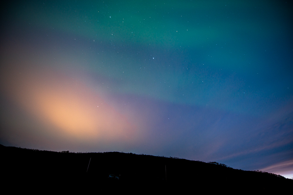 Langsam nimmt das Geschehen Fahrt auf, die dünne hohe Wolkenschicht verhindert aber, dass die Lichter hell zu sehen sind, man sieht sie auch etws milchig verwaschen.