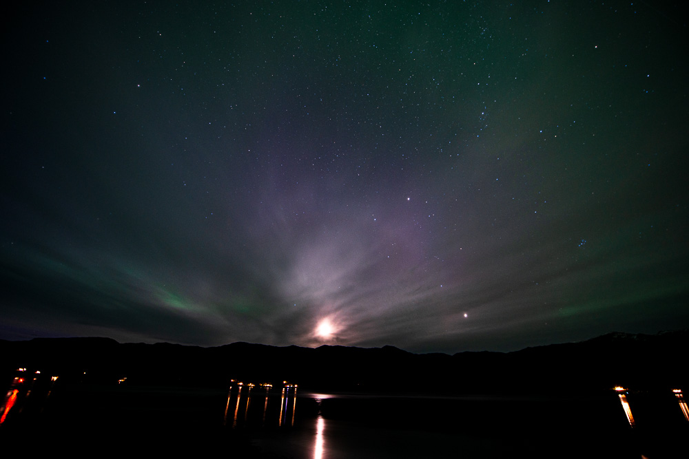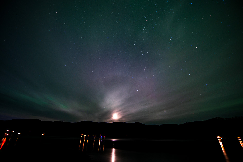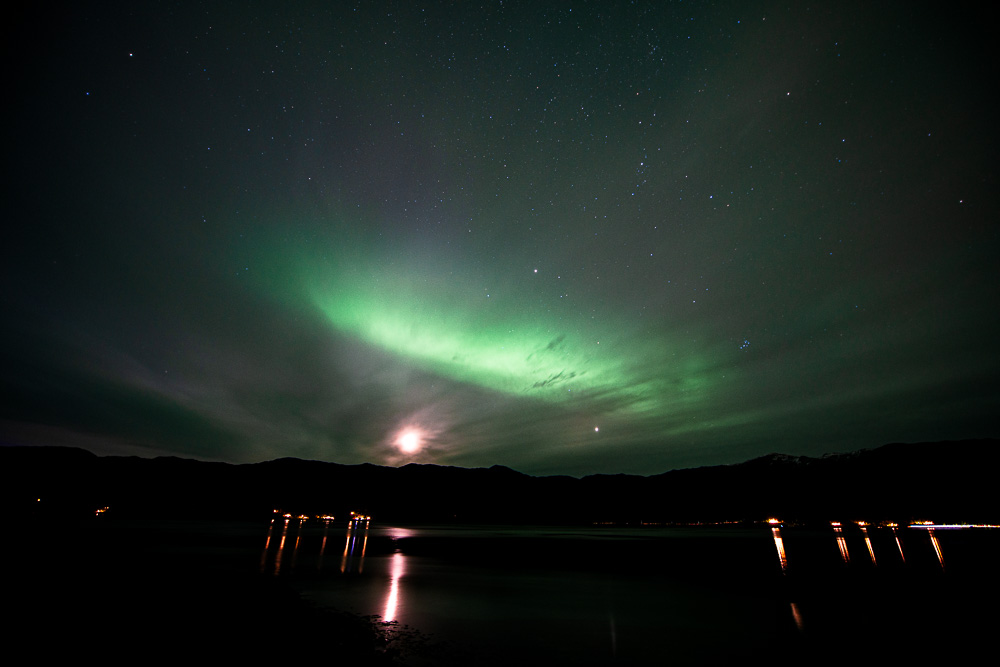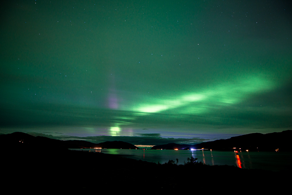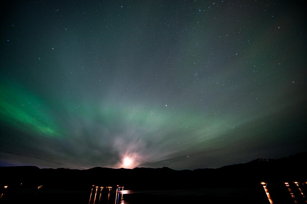 Der Blick nach Süden zeigt am Horizont eine hohe Wolke, die von den Lichtern der Stadt Tromsø angestrahlt wird und gelb leuchtet, die Nordlichter sind grün oder weinrot.