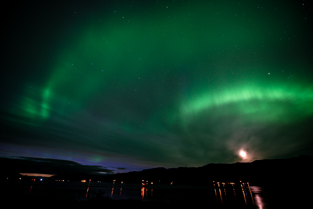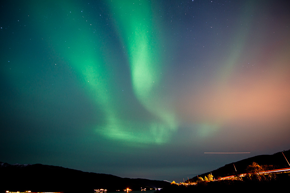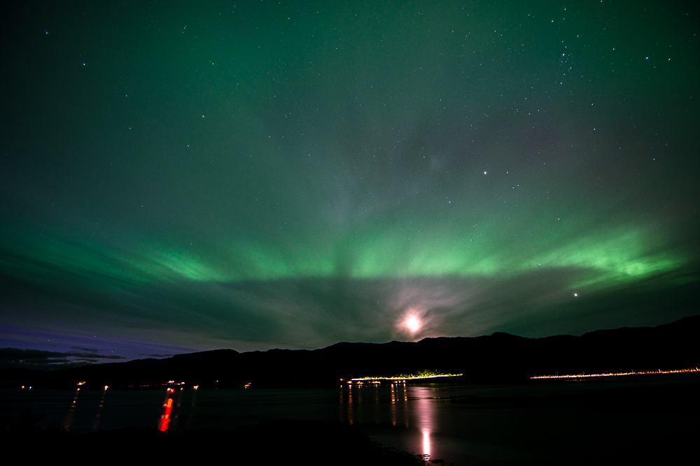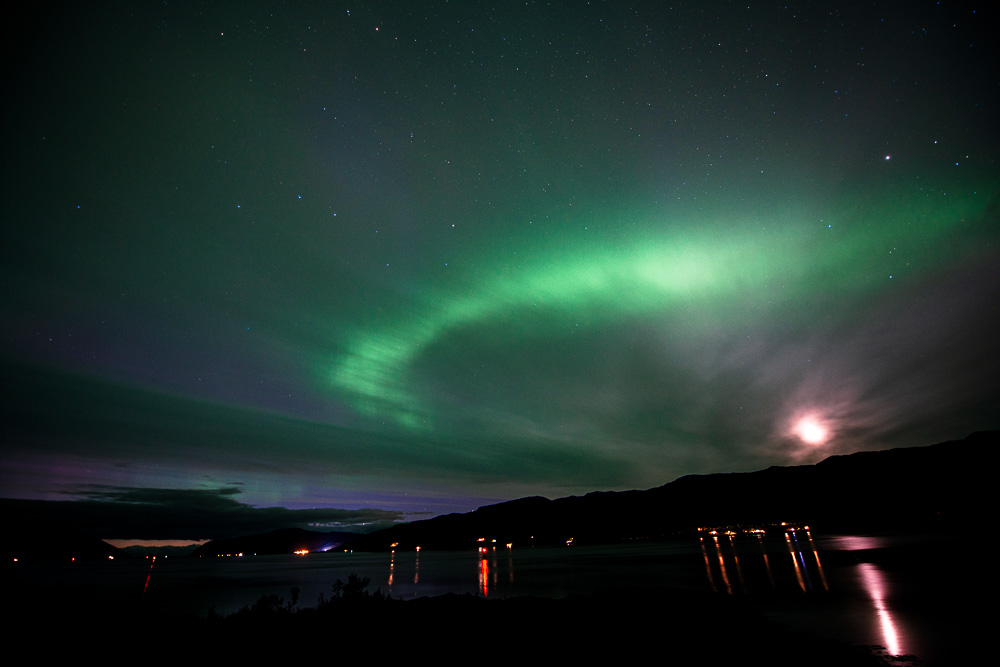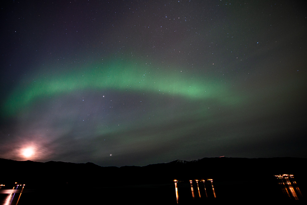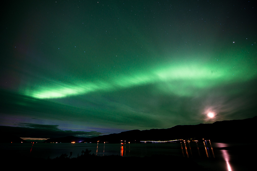 Der Blick nach Süden zeigt am Horizont eine hohe Wolke, die von den Lichtern der Stadt Tromsø angestrahlt wird und gelb leuchtet, die Nordlichter sind grün oder weinrot.