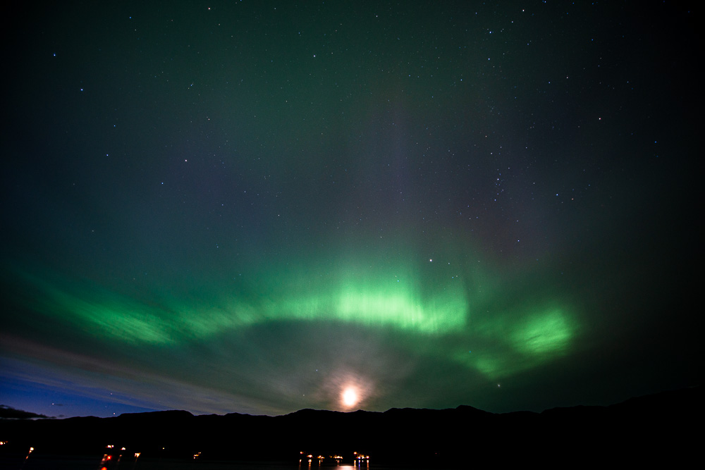 Nordlichter wie ein Strahlenkranz um den Mond.