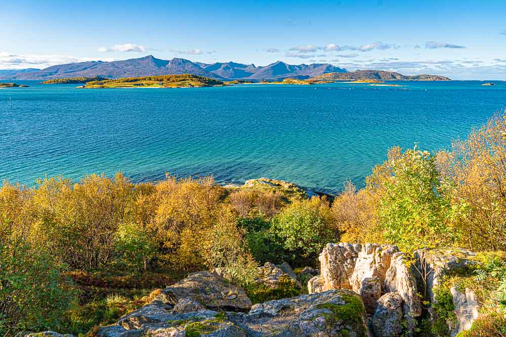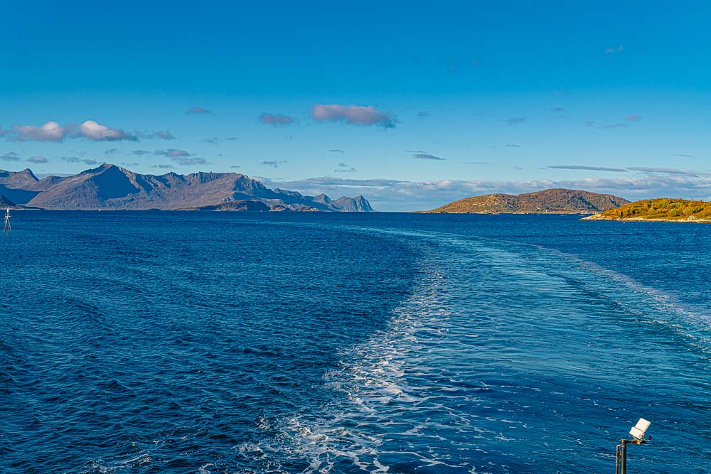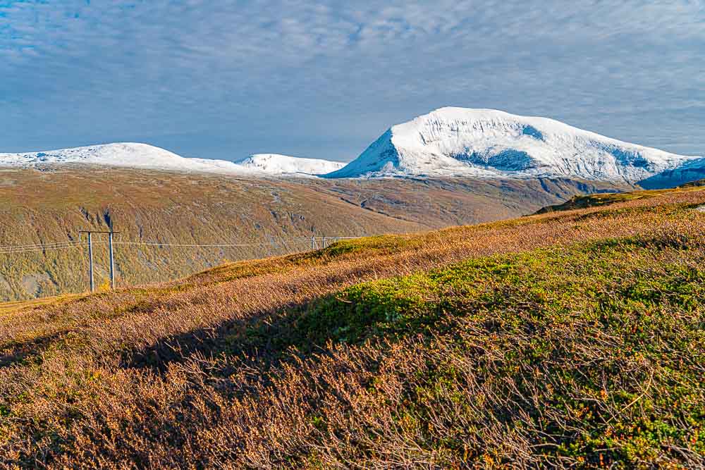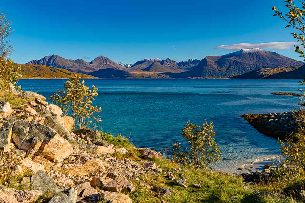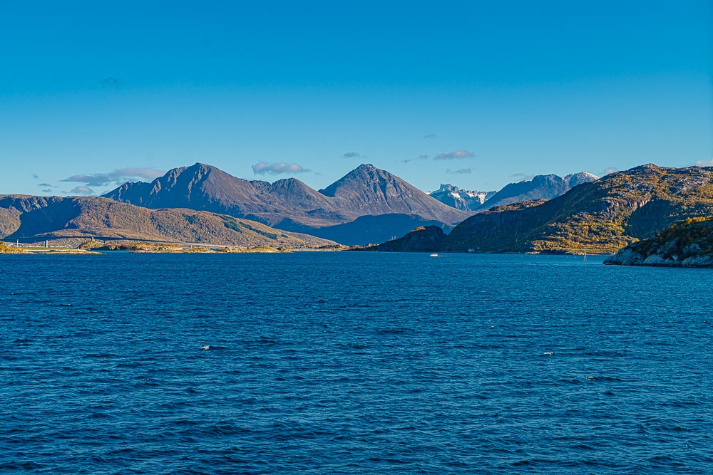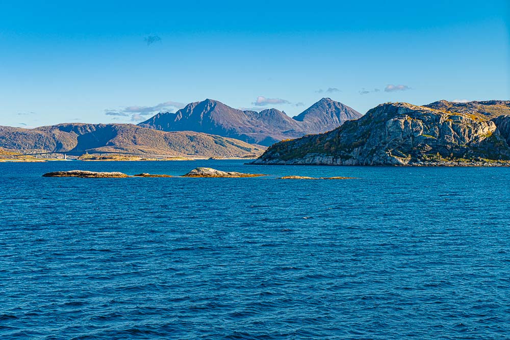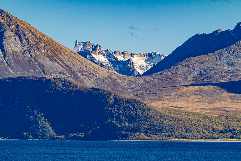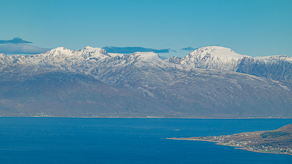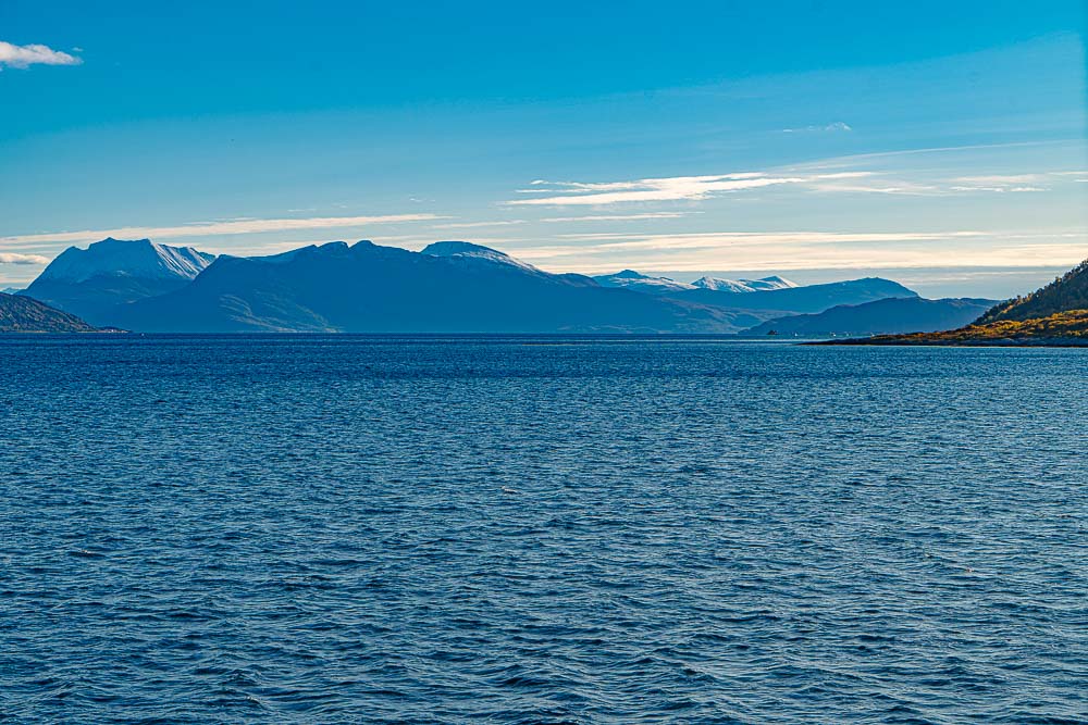 Es öffnet sich jetzt der Blick zu fernen Bergen auf dem Festland südwestlich von Tromsø, vermutlich Bentsjordtinden (1.169 m) und Klemmartinden (1.047 m).