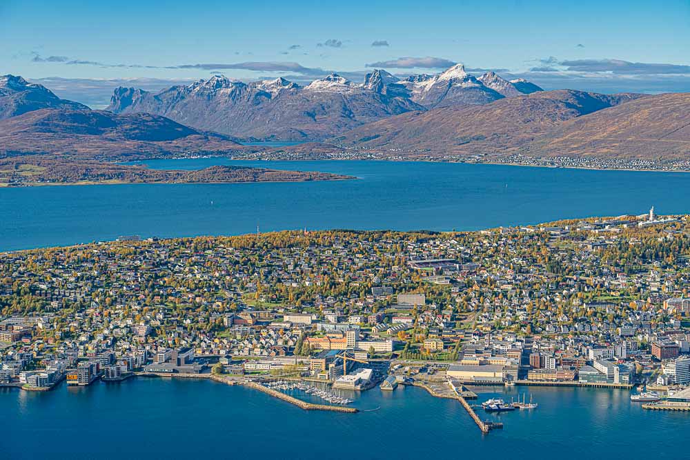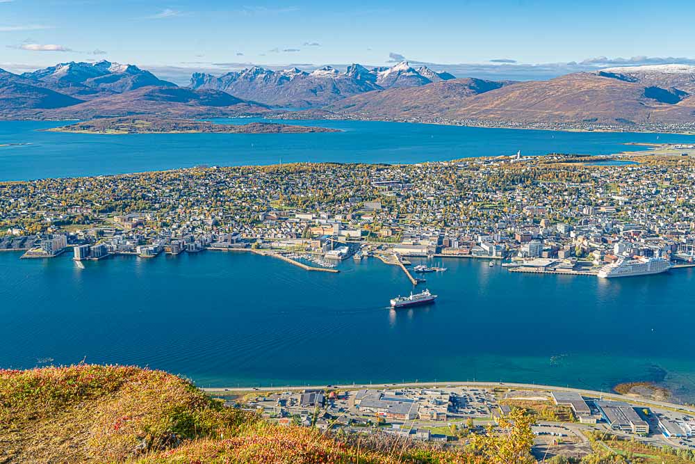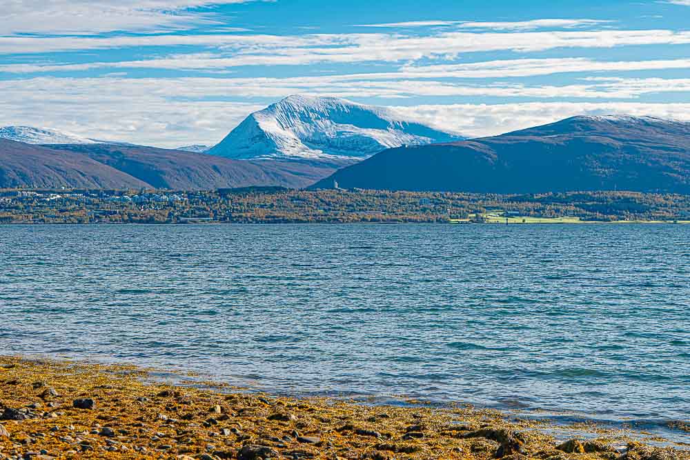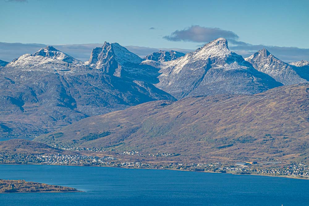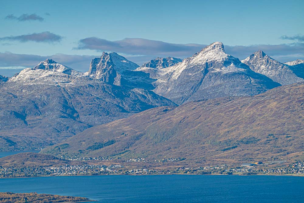 Von Nordbotn hat man schon einen Blick auf Teile der Stadt Tromsø und den dahinter aufragenden Tromsdalstinden (1.238 m)