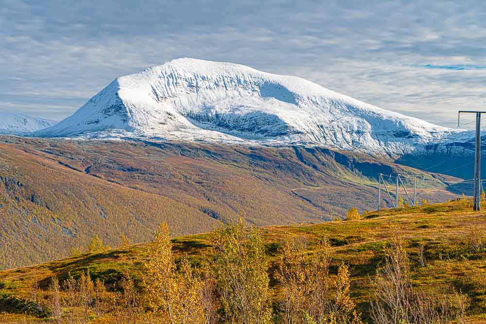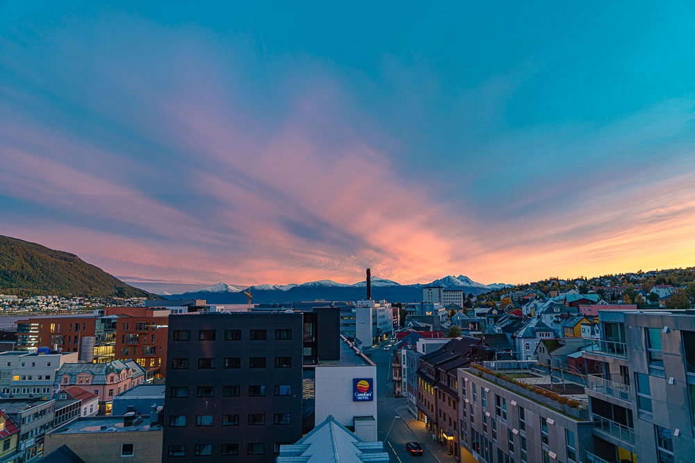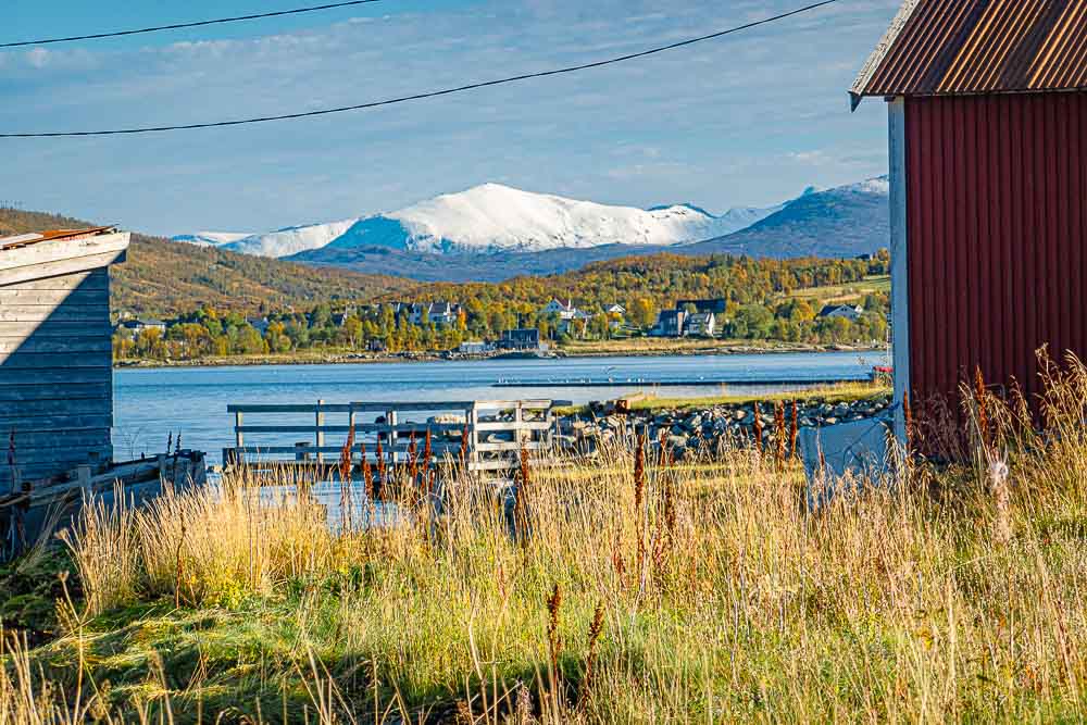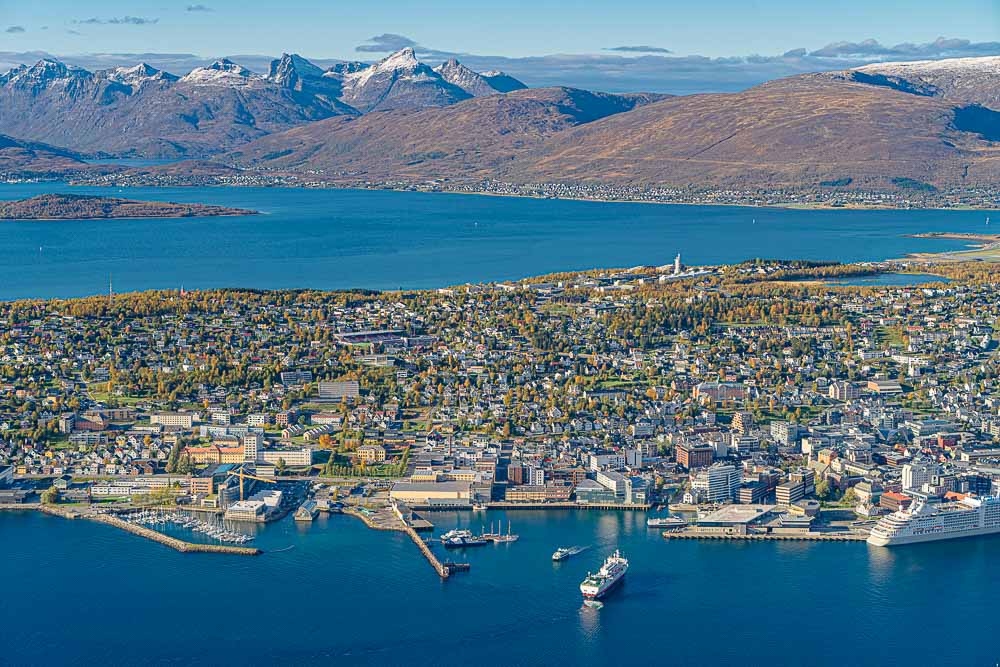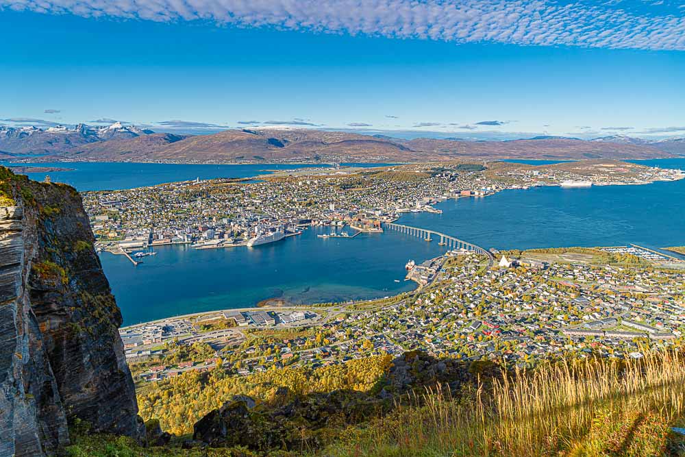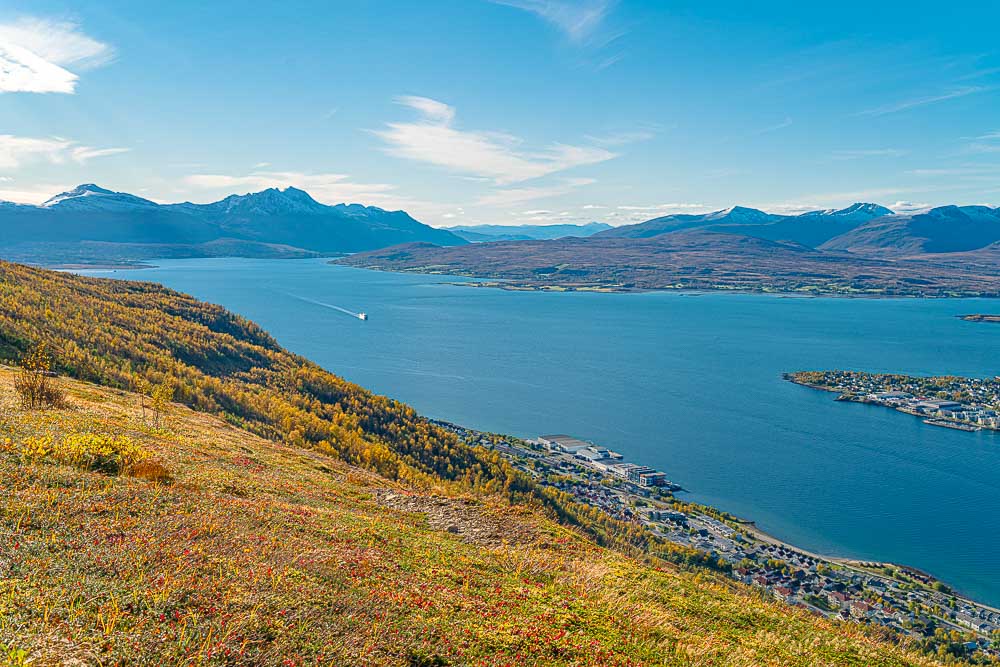 Von Nordbotn hat man schon einen Blick auf Teile der Stadt Tromsø und den dahinter aufragenden Tromsdalstinden (1.238 m)