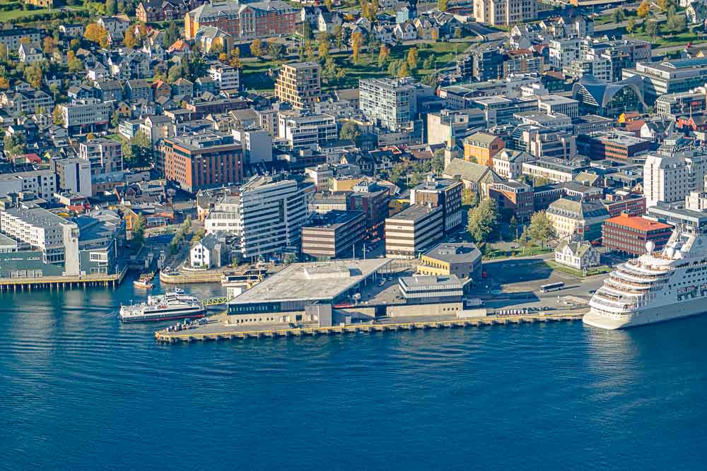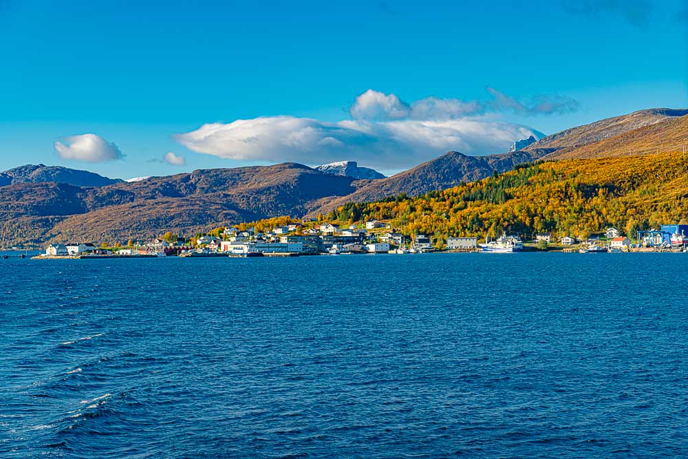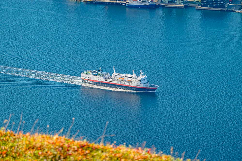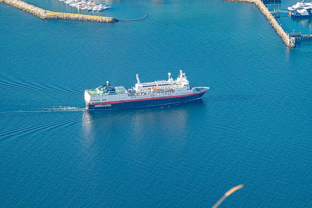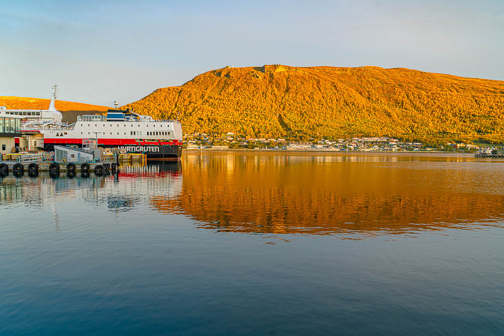 Blick vom Hafen zum Hurtigrutenschiff und zum Storsteinen/Fjellheisen.