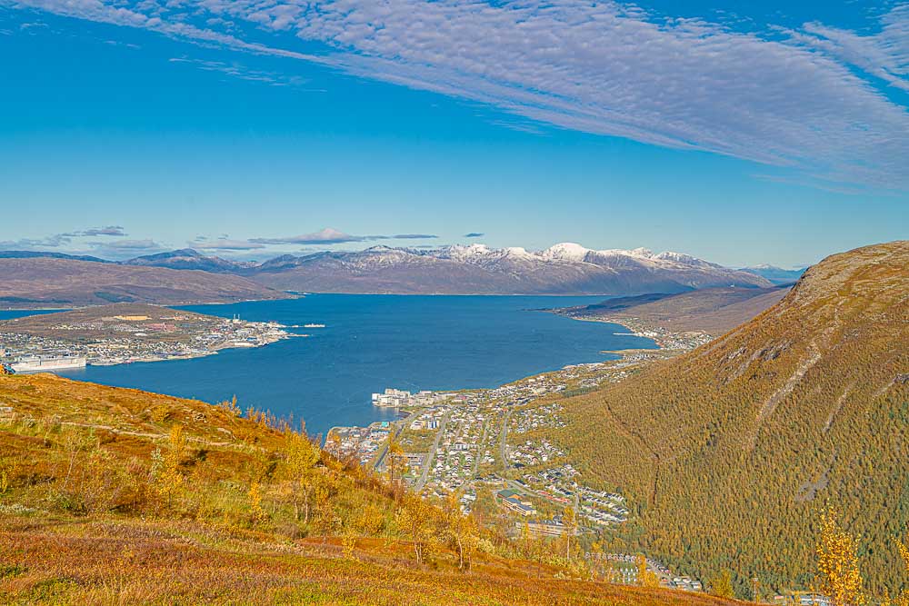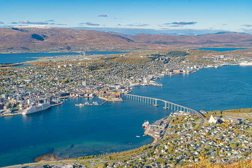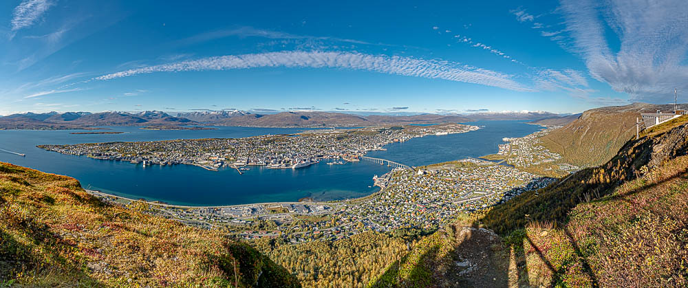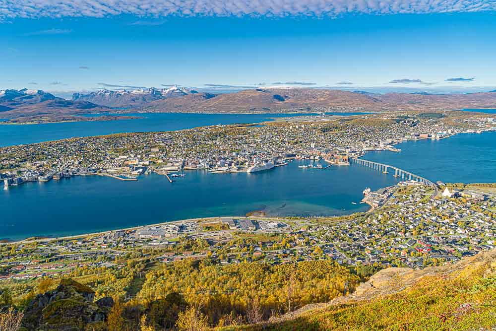 Blick vom Fjellheisen nach Norden, über Tromsø zur Insel Ringvassøya.