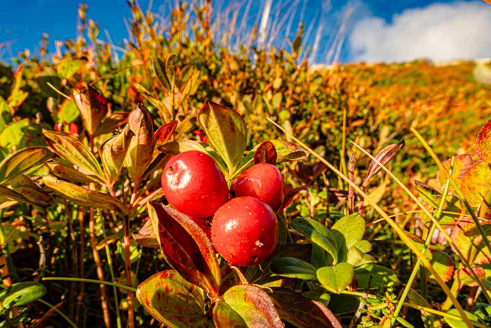 Rotes Laub der dicht wachsenden Heidelbeersträucher.