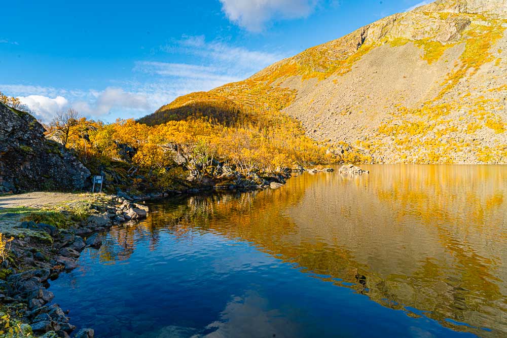 Wir sind weiter gefahren zur kleinen Ortschaft Tromvik und auf einen kleinen flachen Sattel auf der Straße nach Rekvik, wo wir auf 270 m Seehöhe unser Auto auf einem großen Parkplatz abstellen.