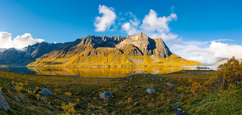 Panoramabild von Sessøyfjord, dahinter Nordsund und Ersfjord. Hierher oder ins Bild klicken für eine größere Darstellung.