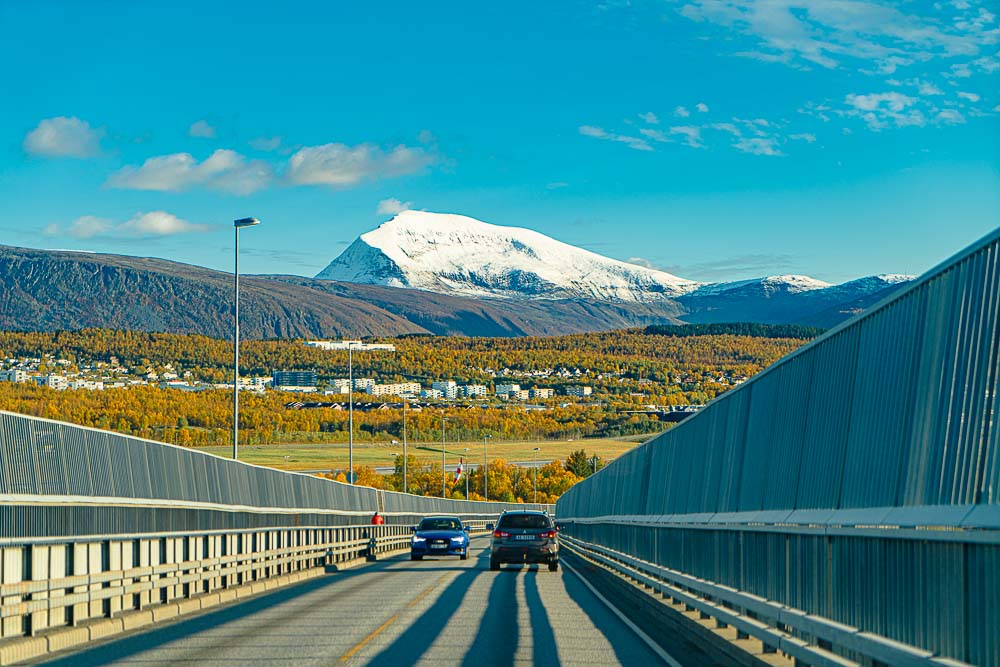 Unterwegs auf der Brücke über den Sandnes-Sund, vor uns Tromsø und, hinter Tromsøya und dem Tromsøysund, der Tromsdalstinden.