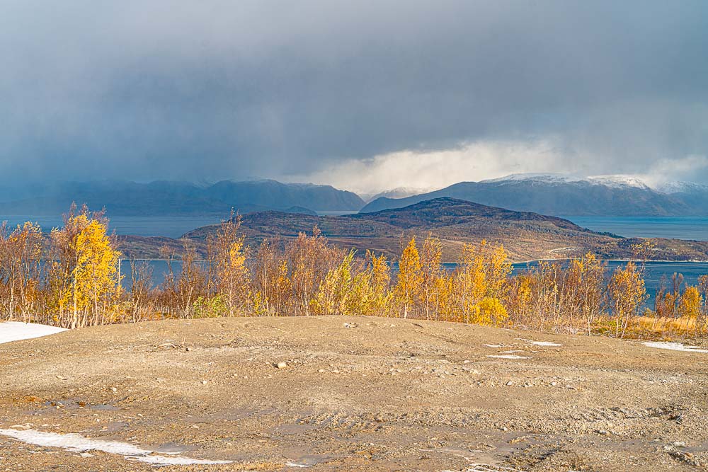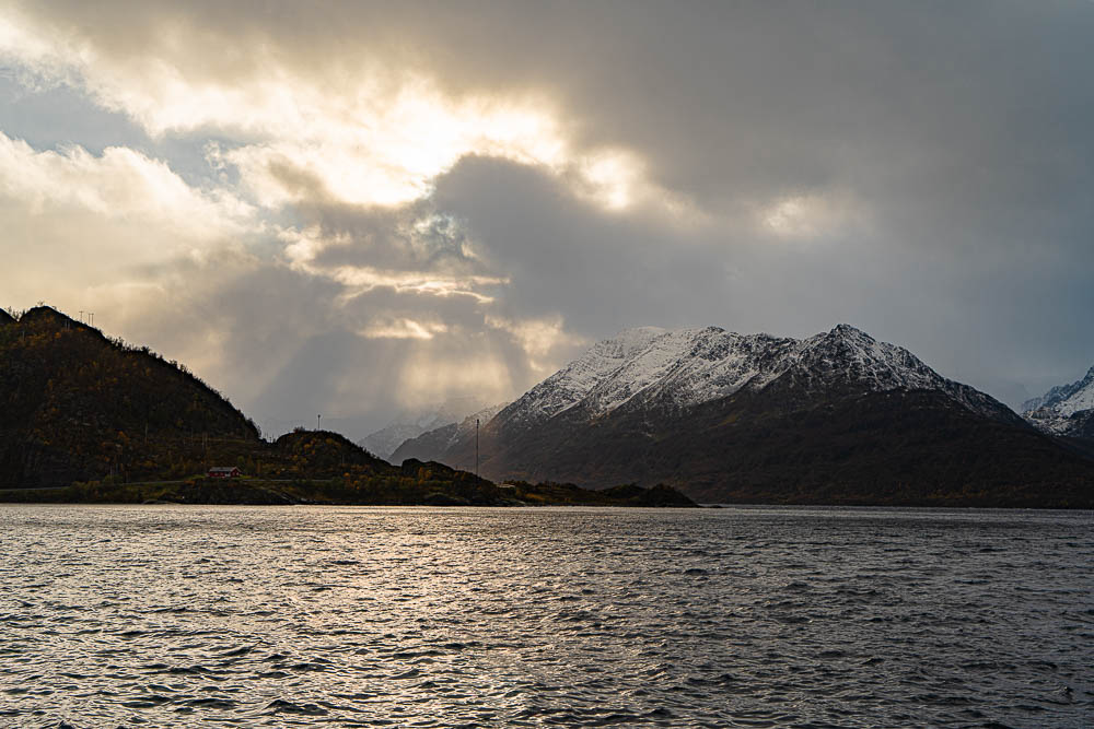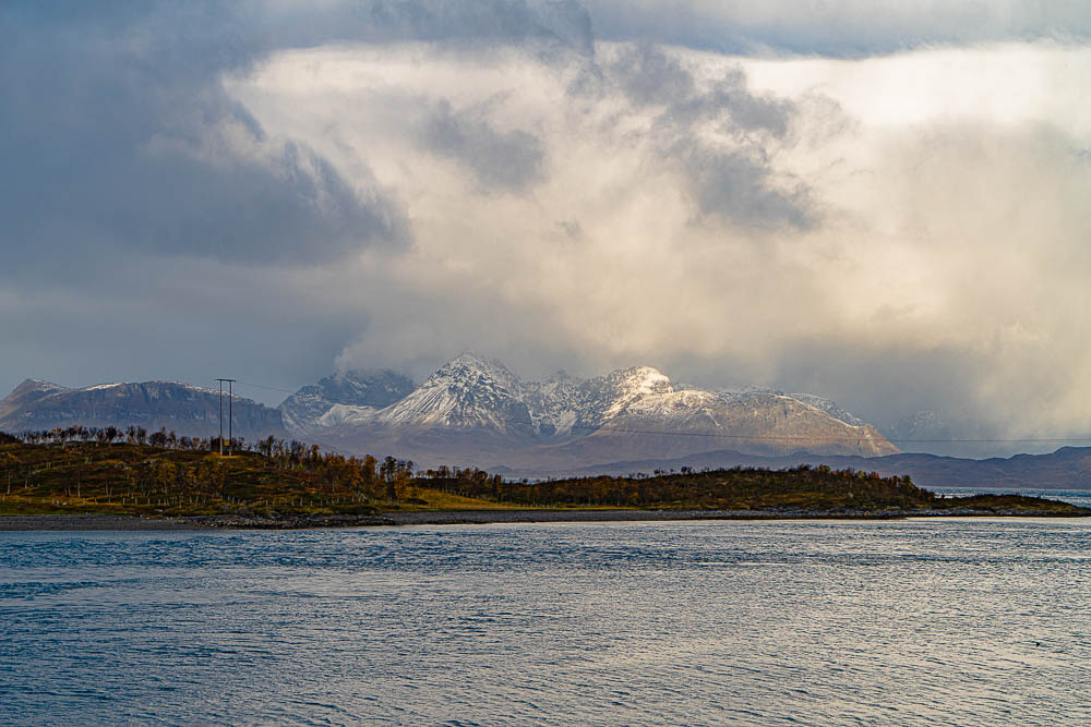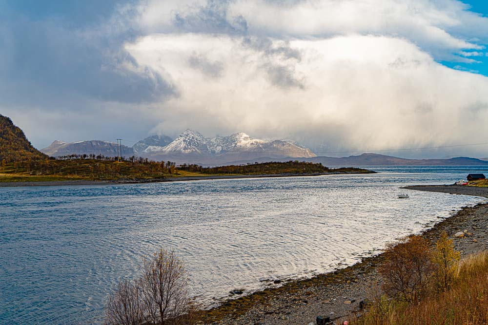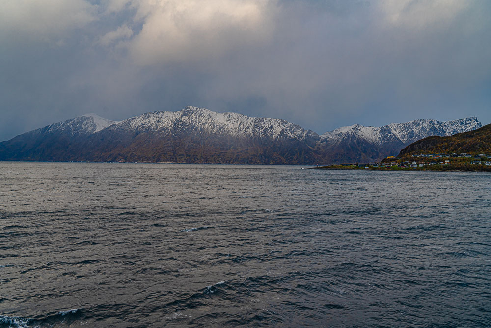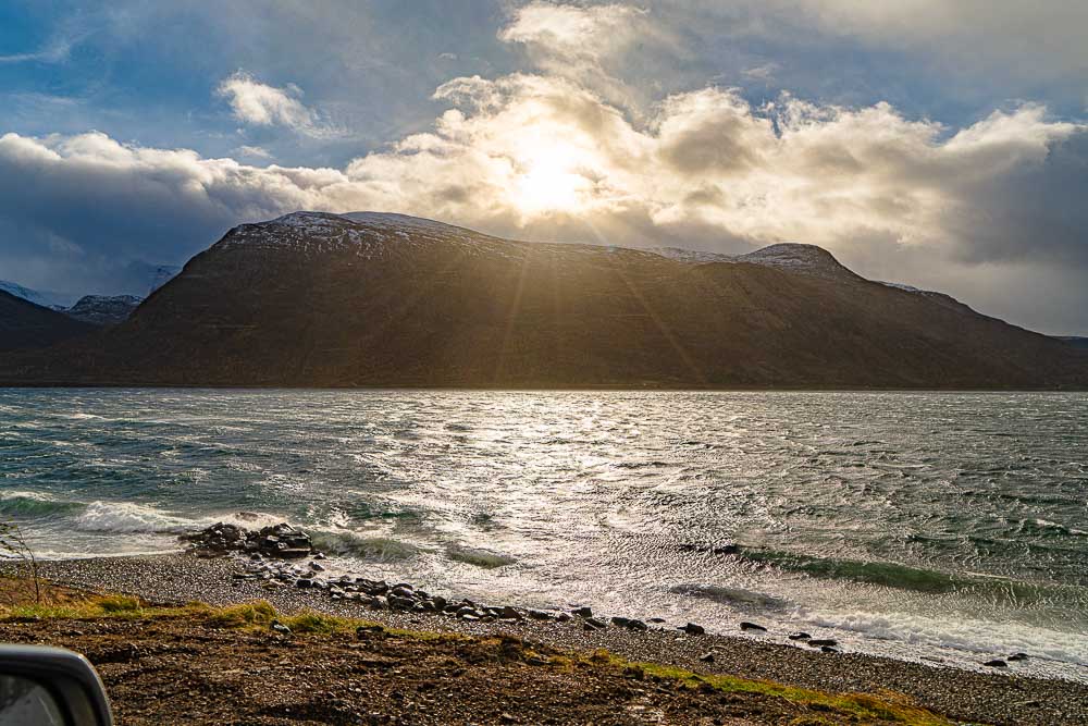 Wir sind schon von der E6 abgezweigt und auf dem Weg nach Øksfjord. Blick über den Langfjorden zum Lassefjellet (1.123 m). Hier herrscht ein so starker Sturm, dass es mir die Autotür aus der Hand gerissen hat. Zum Glück hat das Türfangband gehalten.