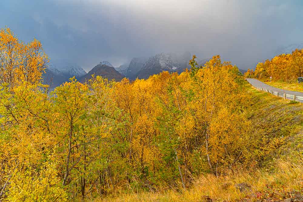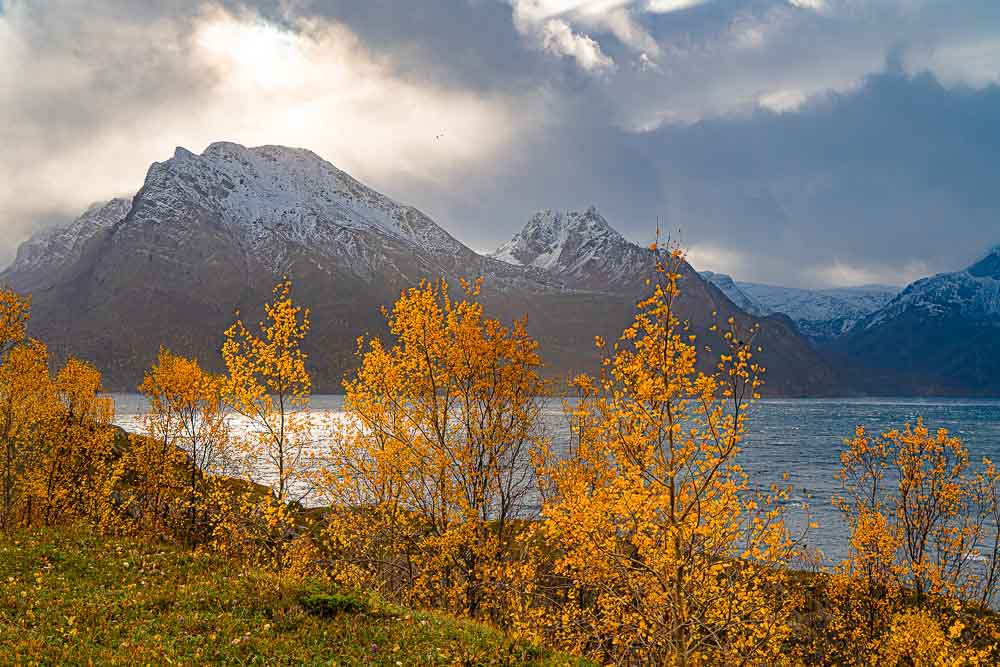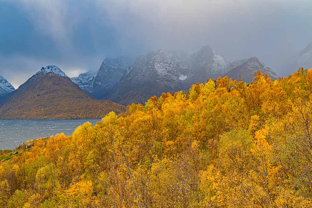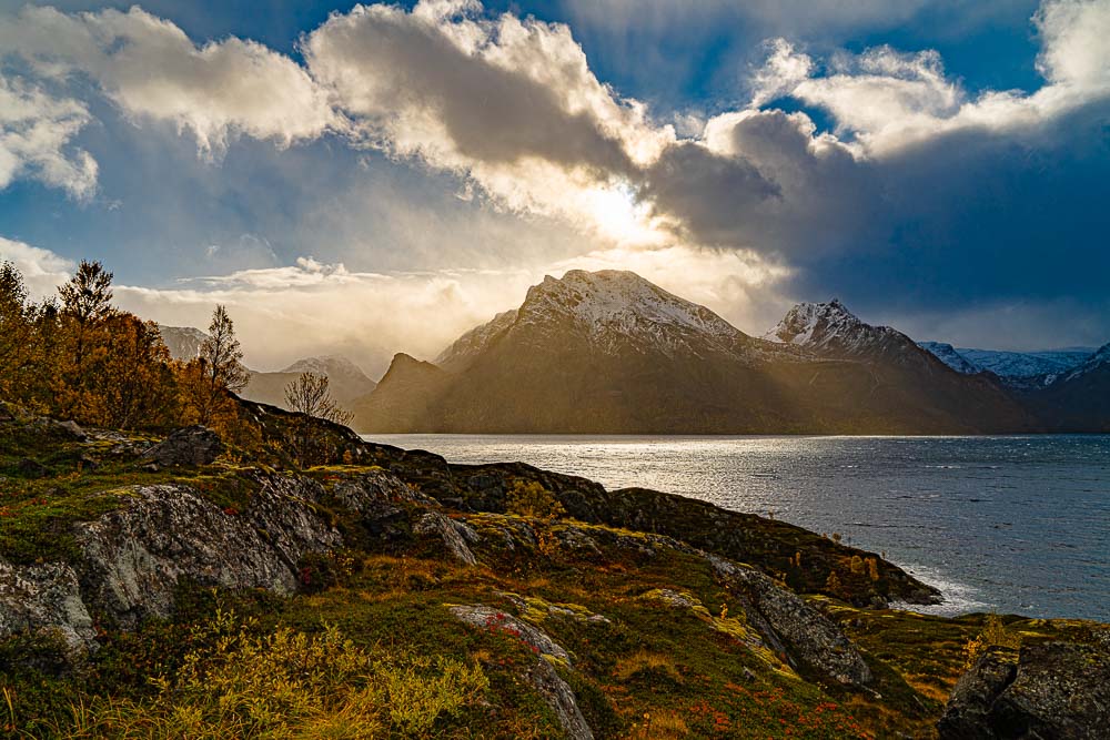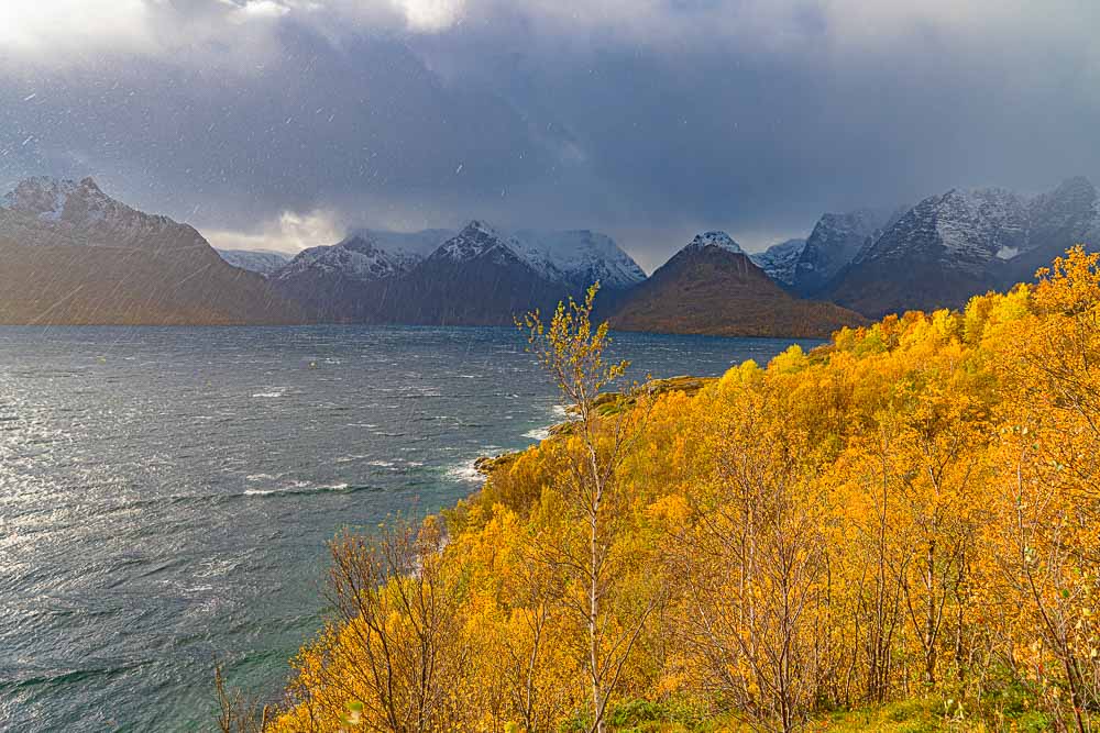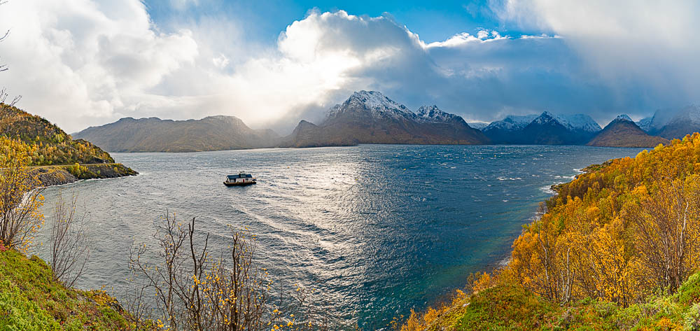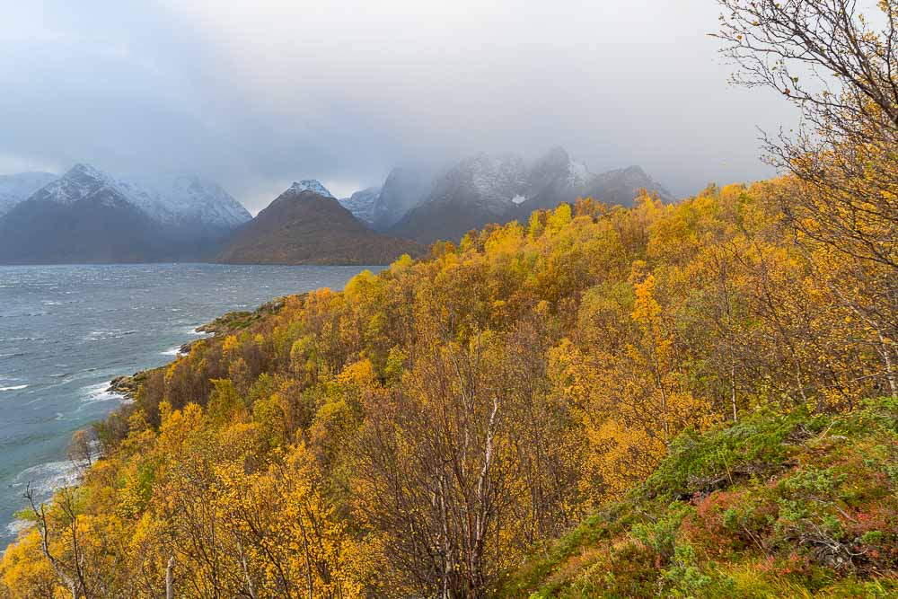 Wir sind schon von der E6 abgezweigt und auf dem Weg nach Øksfjord. Blick über den Langfjorden zum Lassefjellet (1.123 m). Hier herrscht ein so starker Sturm, dass es mir die Autotür aus der Hand gerissen hat. Zum Glück hat das Türfangband gehalten.