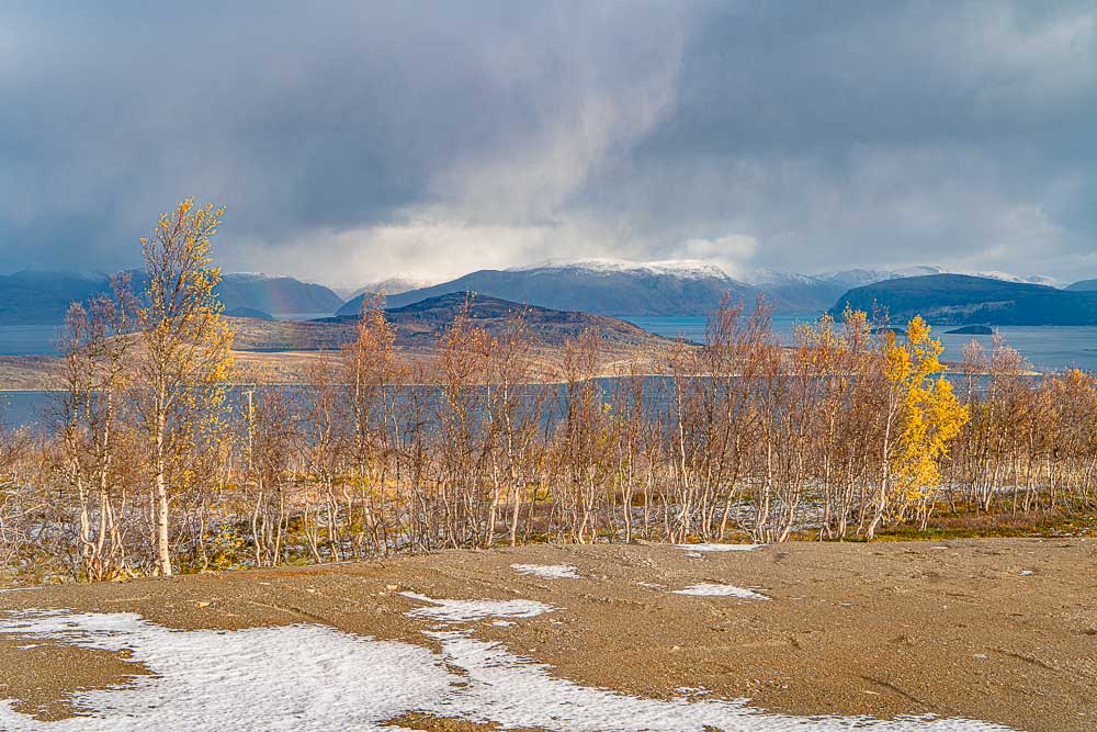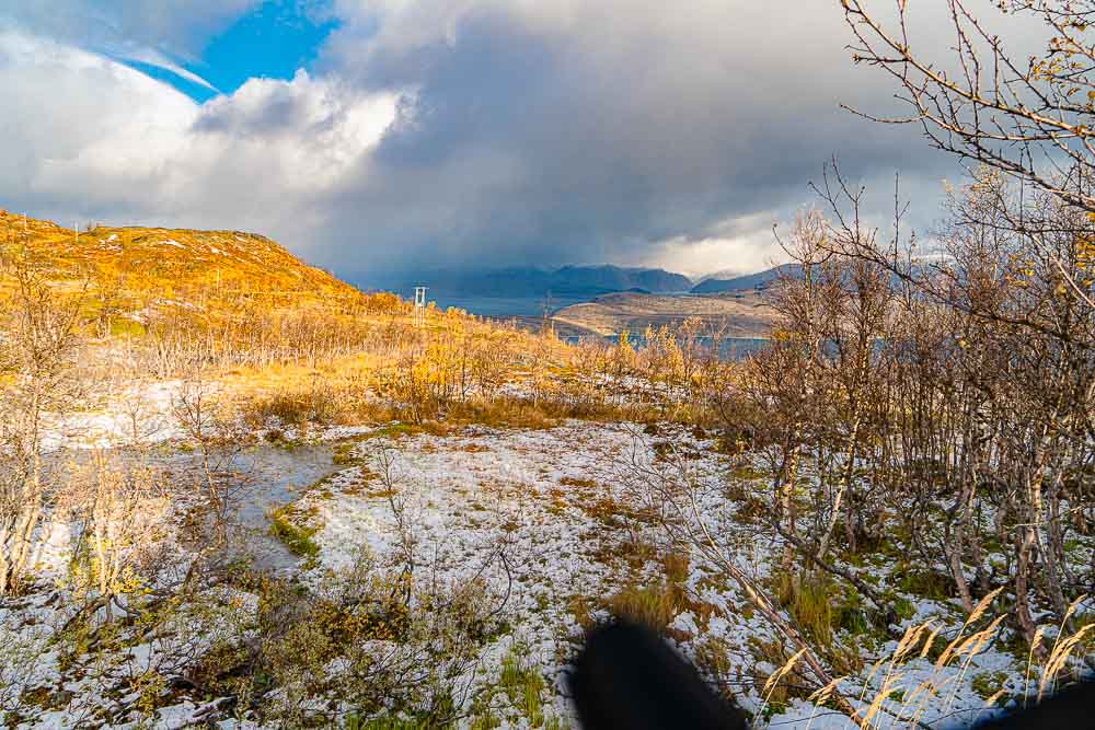 Beim Kvænangsfjell-Tunnel, auf mehr als 300 m Seehöhe, liegt bereits Schnee, am östlichen Tunnelportal scheint aber die Sonne.