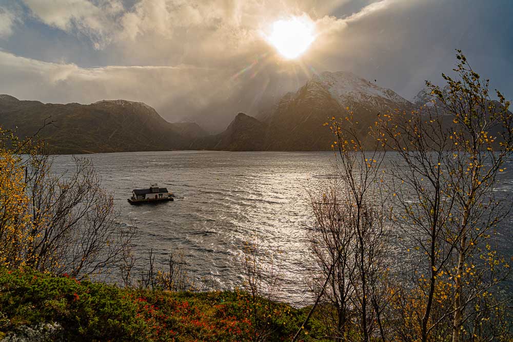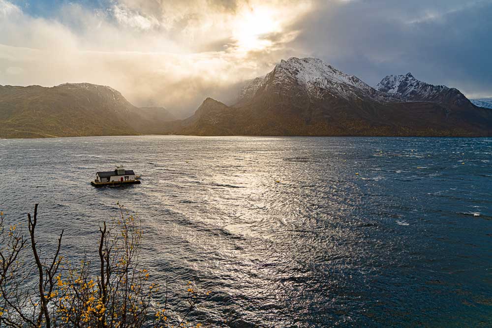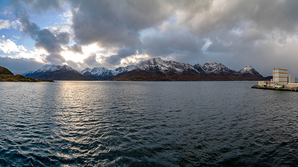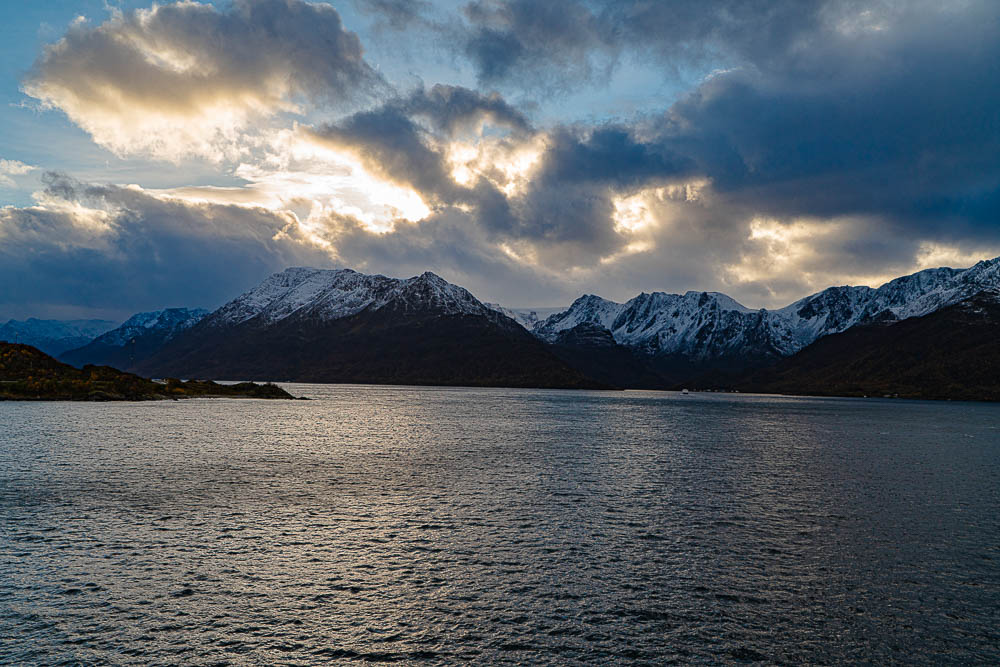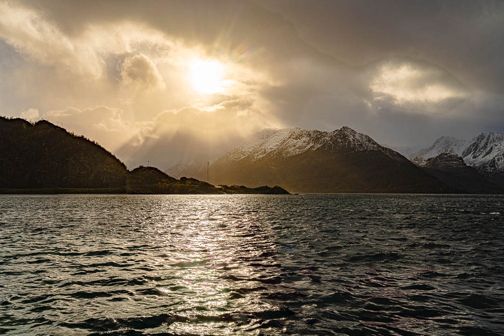 Wieder schöne Lichteffekte hinter dem Øksfjord, während wir bei der Anlegestelle auf das Schiff warten.
