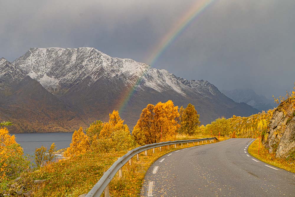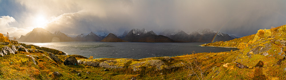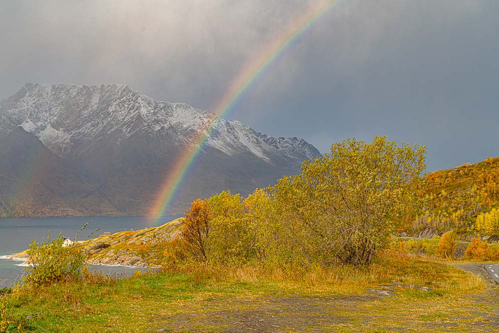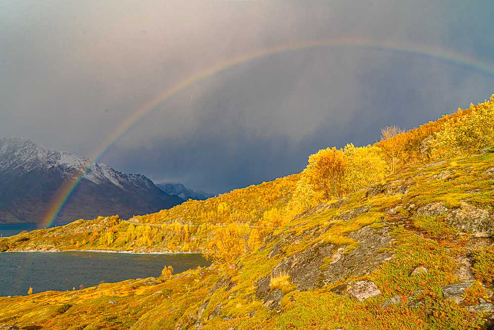 ... und wir biegen, dem Fjord folgend, langsam Richtung Norden ein. Es begrüßt und gleich ein wunderschöner Regenbogen. Vor uns der auf seiner Nordseite vergletscherte Øksfjordjøkelen (1.190 m).