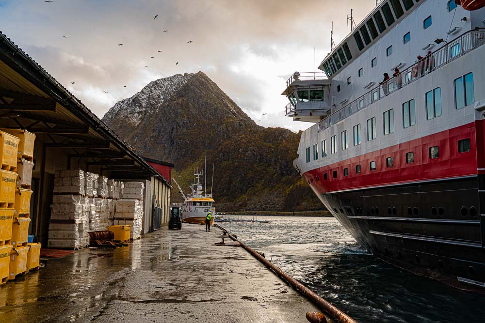 Wir sind um drei Stunden zu früh in Øksfjord eingetroffen, haben die Anlegestelle der Hurtigrutenschiffe erkundet und uns in ein eigentlich geschlossenes Cafe´ zurückgezogen, wo wir bei einem Capuccino abwarten dürfen. Nach 1 1/2 Stunden kommt das Schiff, und wir eilen schnell davon.