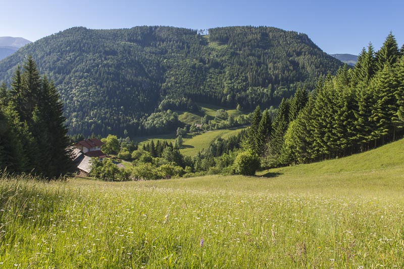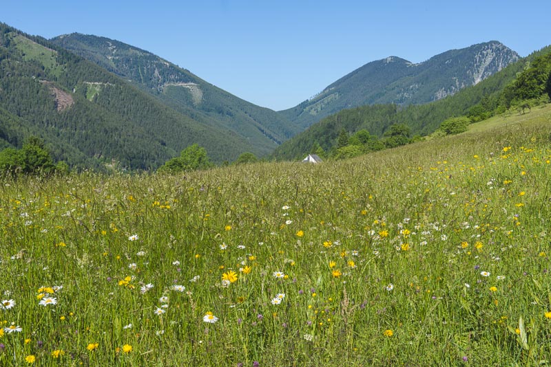 Einen prachtvollen Schönwettertag nutze ich, um mit Herwig Gießwein auf den Obersberg zu gehen. Diesmal wählen wir nicht, so wie am 1.10.2011, den Weg direkt von Schwarzau im Gebirge, sondern wir fahren noch ein Stück ins Tal hinein bis zum Sattel beim Eckbauer. Vo hier aus sind knapp 200 m weniger an Höhe zu überwinden, und der Weg führt über wesentlich mehr Wiesen - Grund genug, um auf Frühsommerblumen zu hoffen.